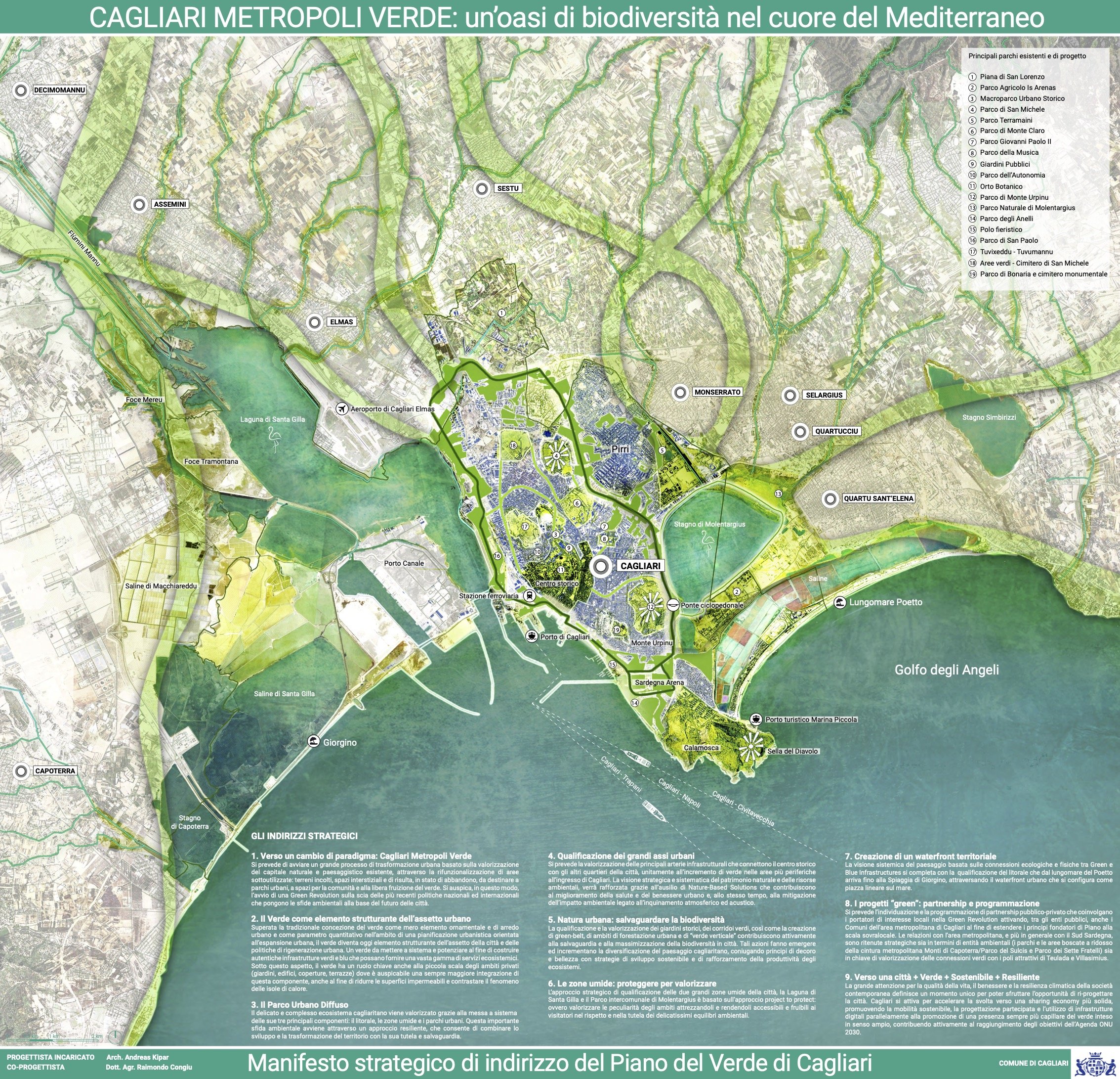 Today, years after the first green plan, it is time to make a difference through Natural Capital Accounting in developing green and blue infrastructure capable of breathing new life into our cities in the fight against climate change. The new green plan aims to initiate a significant process of urban transformation based on the enhancement of the existing natural capital and landscape through the re-functionalization of underutilized areas: uncultivated land, interstitial and waste spaces, in a state of abandonment, to be destined for urban parks, community spaces and the free enjoyment of green. A wide range of ecosystem services, from the transition to green energy sources to increasing accessibility and fruition of the great cultural heritage of natural areas also through Digital Landscape elements (apps, software, websites) to multiply communication opportunities and make Cagliari the green metropolis by the sea.