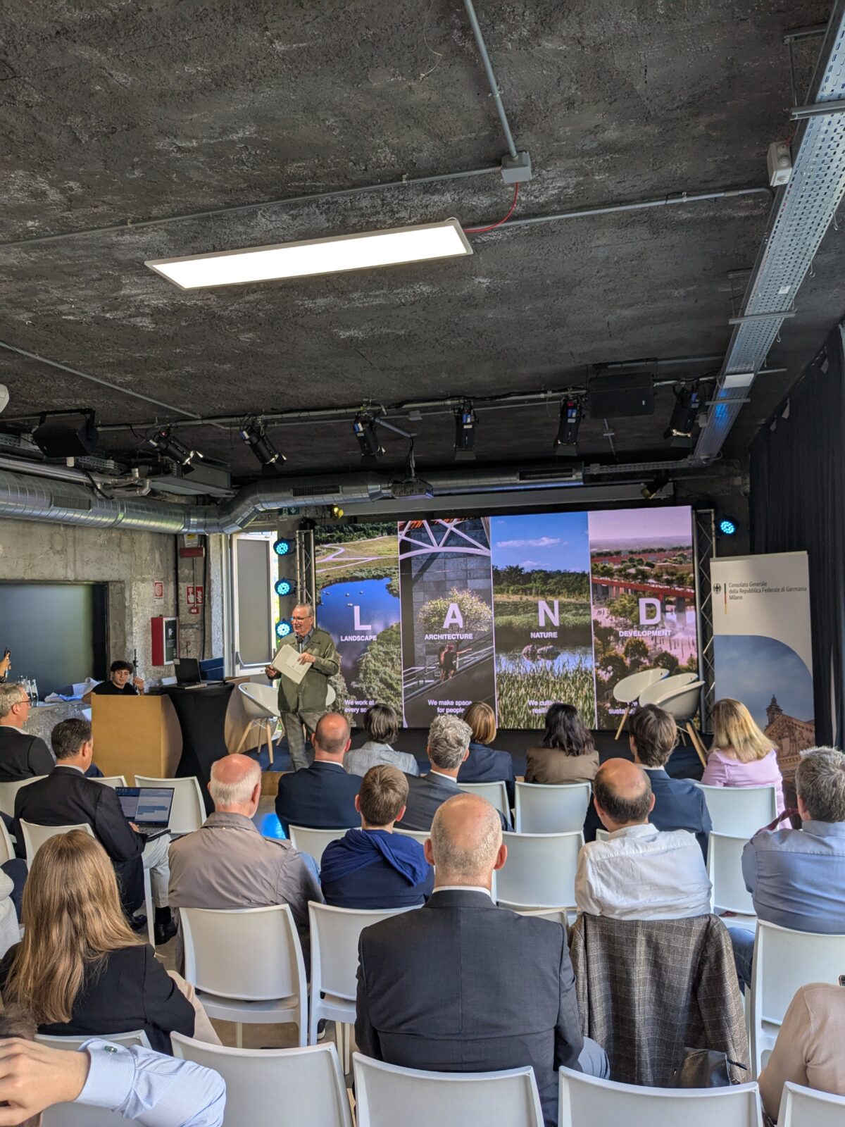 The evening was opened by Susanne Welter, German Consul General in Milan, who examined Germany’s political commitment to climate adaptation and the prospects ahead under the country’s new government. The event opened with a brief greeting from Architect Marino Bottini of the Municipality of Milan. The panel discussion was preceded by a keynote speech from Professor Gabriele Kiefer, German landscape architect and curator of the German Pavilion at the ongoing Venice Biennale, who explored the role of architecture and urban planning in the fight against global warming.