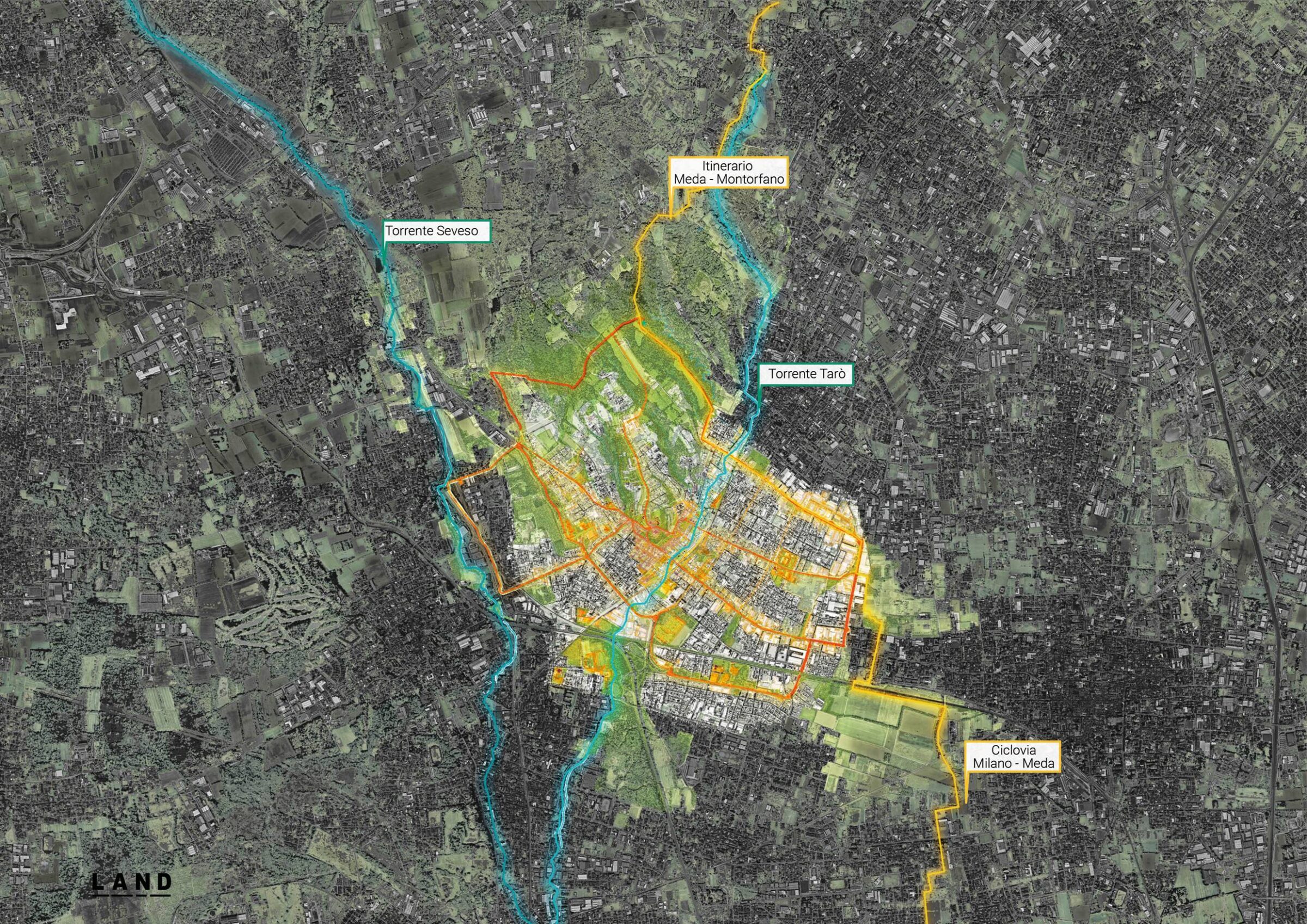 Aflood of Nature is the evocative winning recipe proposed by LAND Italia for the urban regeneration of Meda, a town in Brianza with a rich manufacturing heritage nestled between waterways and productive territories to be enhanced.