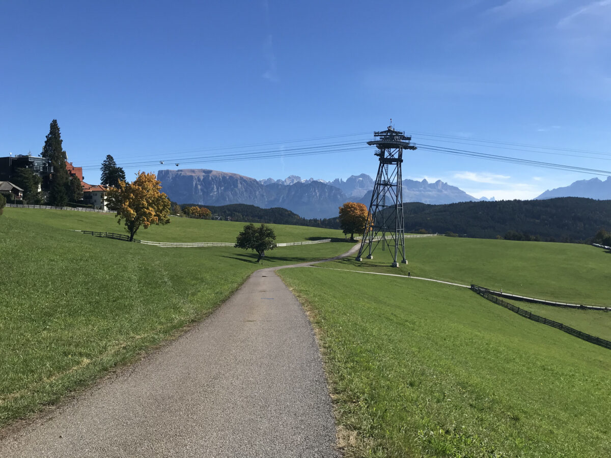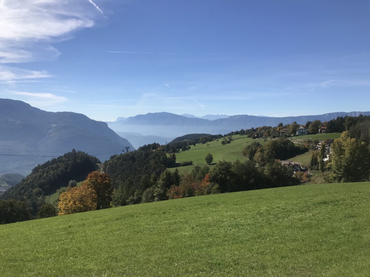 Gray inside and green outside: nothing exemplifies this contrast more as you drift away from the city on the Rittner cable car just behind the station, soaring over arable fields and cultivated pastureland. Here and there cows graze. At the final stop in Oberbozen, where tourists can get on the narrow-gauge railway or take hiking trails across the high plateau, we take a short walk through the pastureland under a warm October sun. Unlike the view from Bolzano, which is trapped in the valley basin, here the vista is unbelievably wide, with a bright blue sky and a panoramic view of the peaks of the Dolomites with glaciers, rocks or forested slopes. According to Chiara, the landscape from the Rittner cable car shows “a typical South Tyrolean relationship between open land and wooded areas.” At the same time, she complains that the lovely, gleaming green meadows are overfertilized, which negatively affects biodiversity. “There is something artificial about what tourists think is pure Nature.”