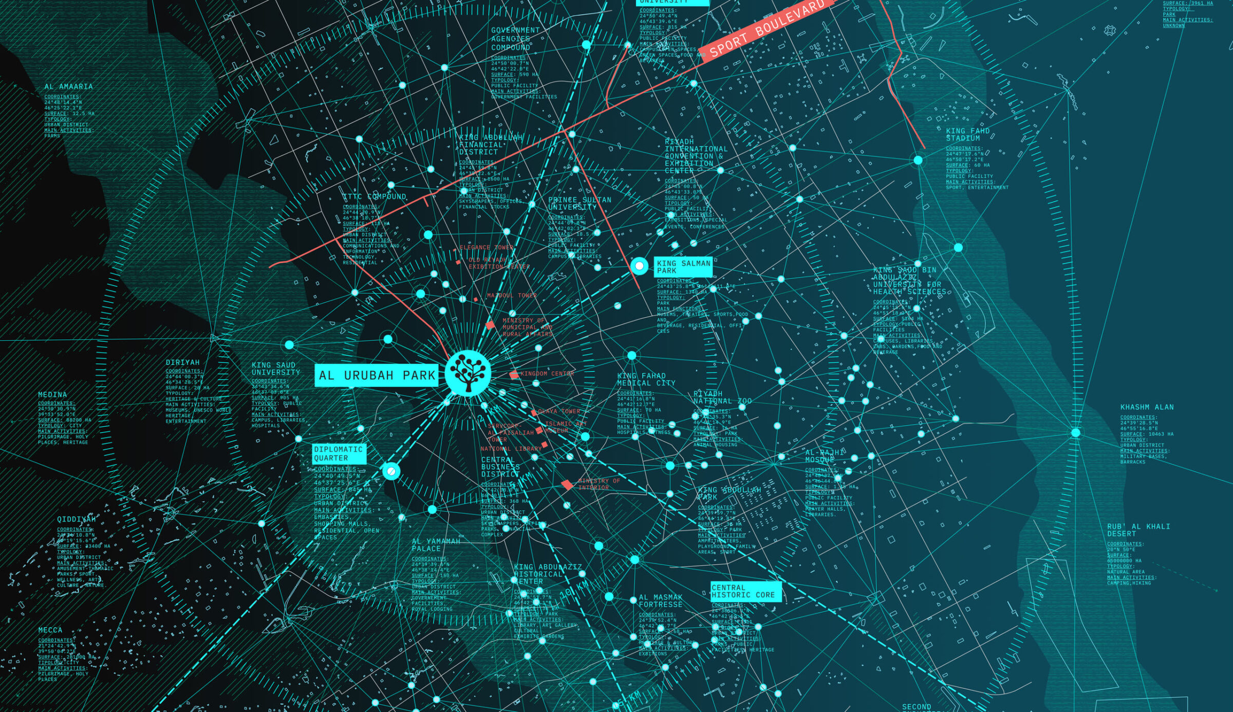 It looks like a constellation, but it’s a digital representation of a grand vision in the Saudi capital of Riyadh. The Green Riyadh Plan aims to increase the city’s natural areas from the current 1.5 percent to 9.1 percent within a decade. The plan, now the largest greening concept in the world, incorporates elements from the visionary landscape architect Richard Bödeker (1934-2019) of Mettmann, Germany (near Düsseldorf), who was the first purposefully to bring Eastern and Western thinking together. The core element is the new Al Urubah Park, being designed by a multidisciplinary project team led by LAND, which was awarded the international tender. Thanks to its system for storing water during heavy rains – which Riyadh gets at irregular intervals – Al Urubah Park can be considered a model of resilience for innovative landscaping in urban spaces.