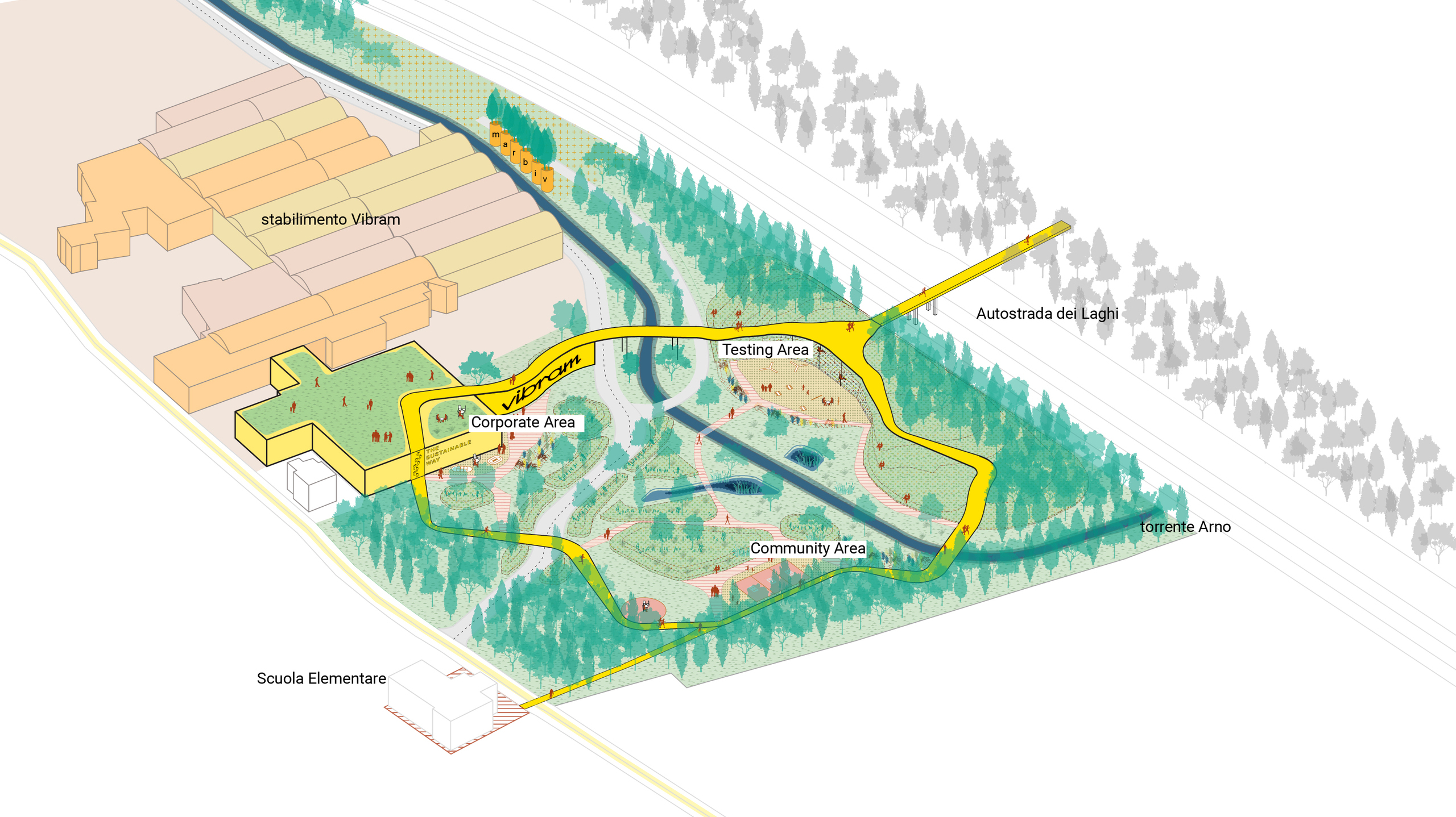 The proposed master plan includes green infrastructure strategies that can connect the system of open spaces to the new industrial structure, thus creating an integrated architecture and landscape design. Nature becomes an element that can define and characterize the various areas, creating on one hand a recognizable green master key that can determine access points and screen production areas, and on the other introducing natural elements and biodiversity to the center of the Park with a synergistic relationship to the existing waterway, in order to create a true green-blue infrastructure. The addition of a Vibram experiential pathway, winding through the Park along different levels, is intended to help visitors discover the company units that enliven these open spaces and to itself become a landmark and iconic element of the Albizzate headquarters.