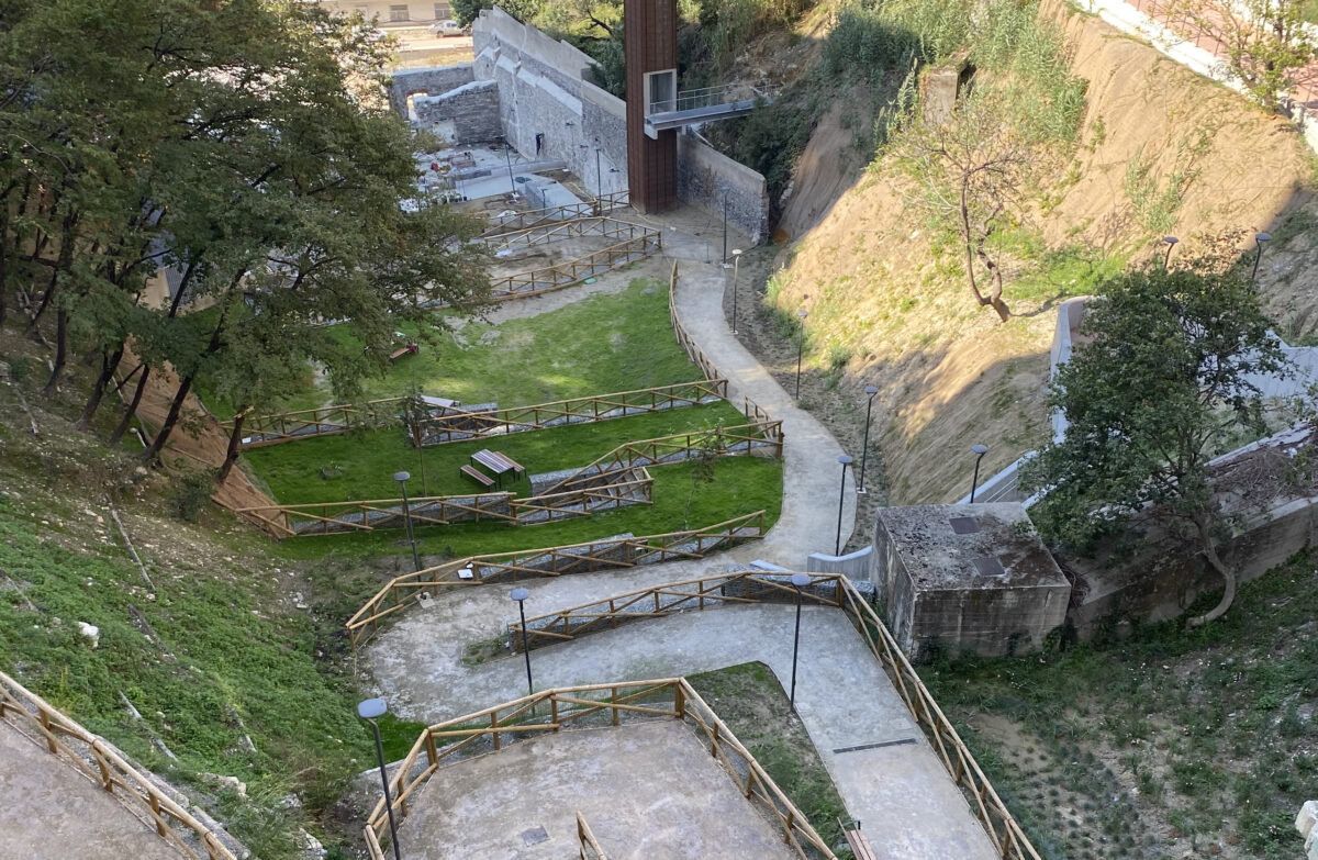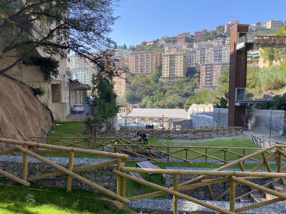 October 2022: bulldozers, trucks, workers. Work is in full swing on the site for the imminent delivery of the park. Looking at it from this viewpoint, the difference in height within which the park will develop is dizzying: about 60 metres from the lowest point to the highest, with a series of terraces stretching up the hill. Typical Ligurian verticality. For this reason, the park is a pilot case study as a laboratory for experimenting with natural solutions in Genoa, which is sadly known for its hydrogeological instability; the City Council, together with project partners IRE Liguria and LAND Italia, hopes that the model can be replicated on a large scale that will completely change the face of the city. Davide points out the parts of the site that have yet to be completed and those that have already been realised: “The rain garden was located in that area, because we realised that the runoff water from the slopes above naturally emerges there, a sort of small natural spring. It’s a very interesting solution, because it is designed to temporarily accommodate rainwater as well, and the temporary presence of water and humidity, in general, helps to counteract the heat island effect and provides a small refuge for biodiversity, as proven by the family of mallards that has already been living here for a few months.