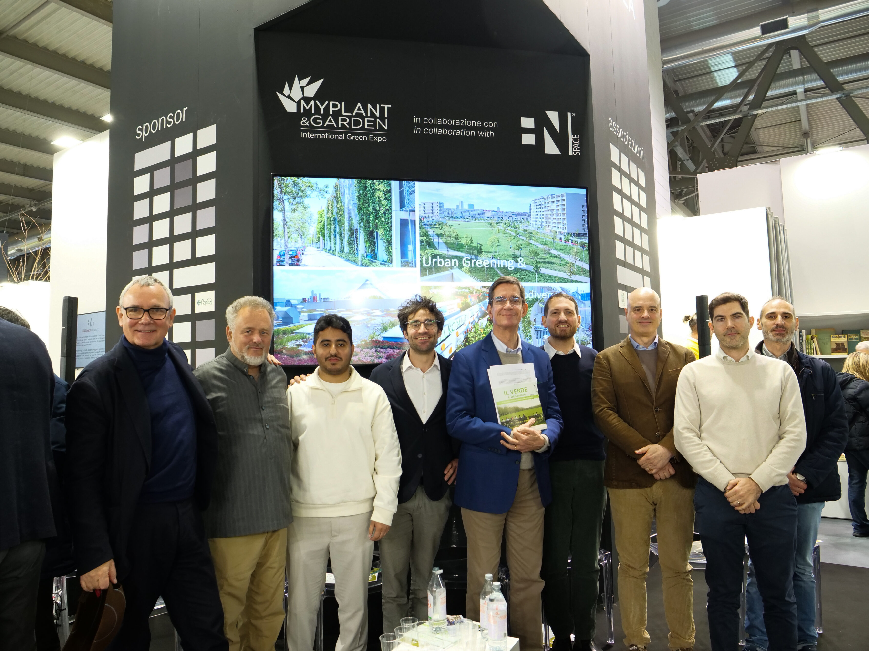 Group photo at Myplant & Garden 2025 in Milan. From left to right: Andreas Kipar, Jens Bödeker, Hussain Al-Hazzani, Michael Gräf, Giovanni Sala, Stefano Roman, Piero Simone, Fabio Lassini, Matteo Pedaso