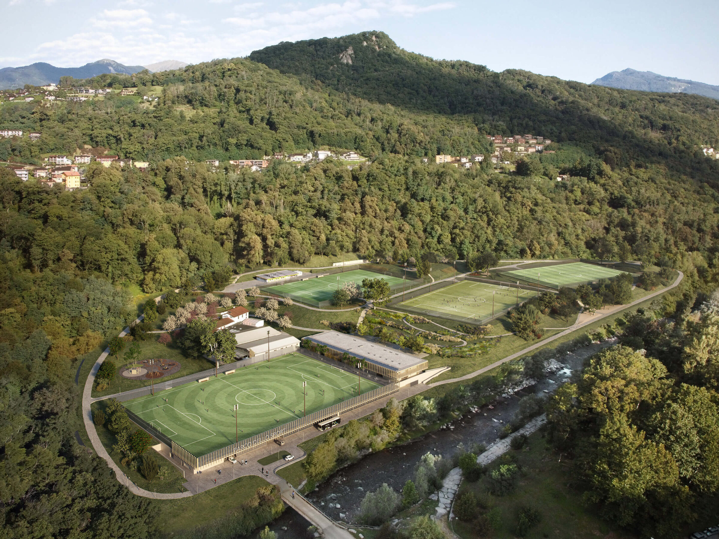 “The project of Parco dello Sport al Maglio begins with the course of the Cassarate River and the ability to accommodate additional functions in hydraulic compatibility. The sports facilities adapt to hydraulic requirements: designing in this way, with a landscape integration shaped by these needs, has led to a new form and a new composition,” the architect says.