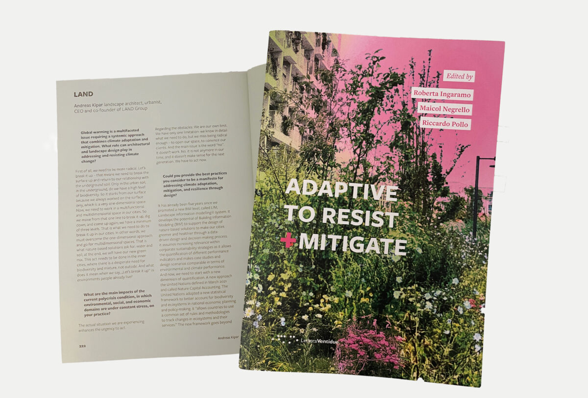 Adaptive to Resist + Mitigate, published by Lettera Ventidue, explores the contribution of research to climate adaptation and mitigation strategies. Two contributions from Andrea Balestrini and Andreas Kipar investigate LAND's Nature-Positive approach in this field.