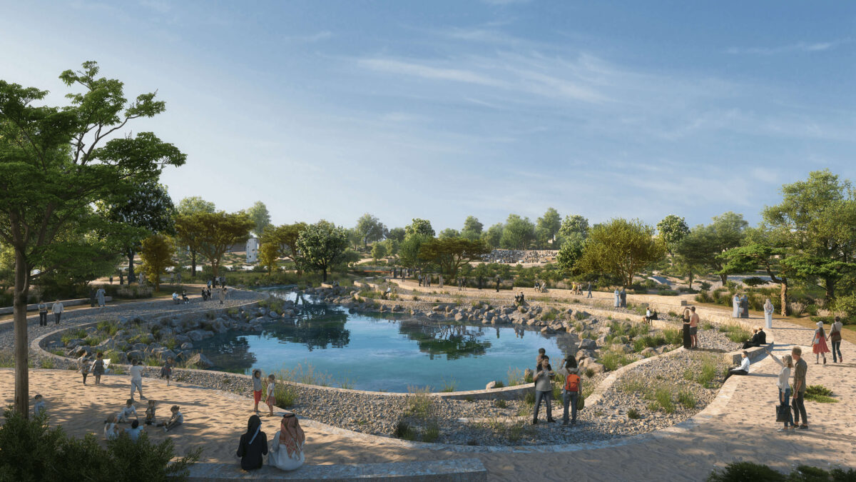 Nature draws inspiration from the presence of the hidden water and its interplay with the urban landscape. The project follows the organic flow of nature featuring over 10,000 trees, winding pathways crafted from local soil, and contemporary urban furniture made from Riyadh stone and granite.