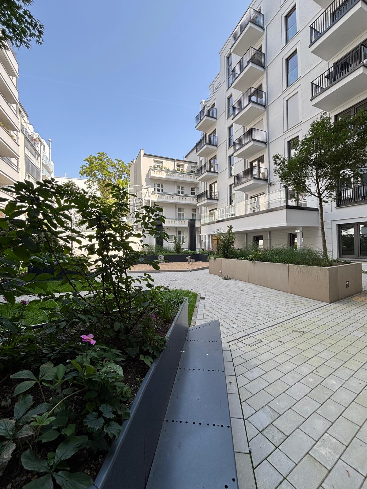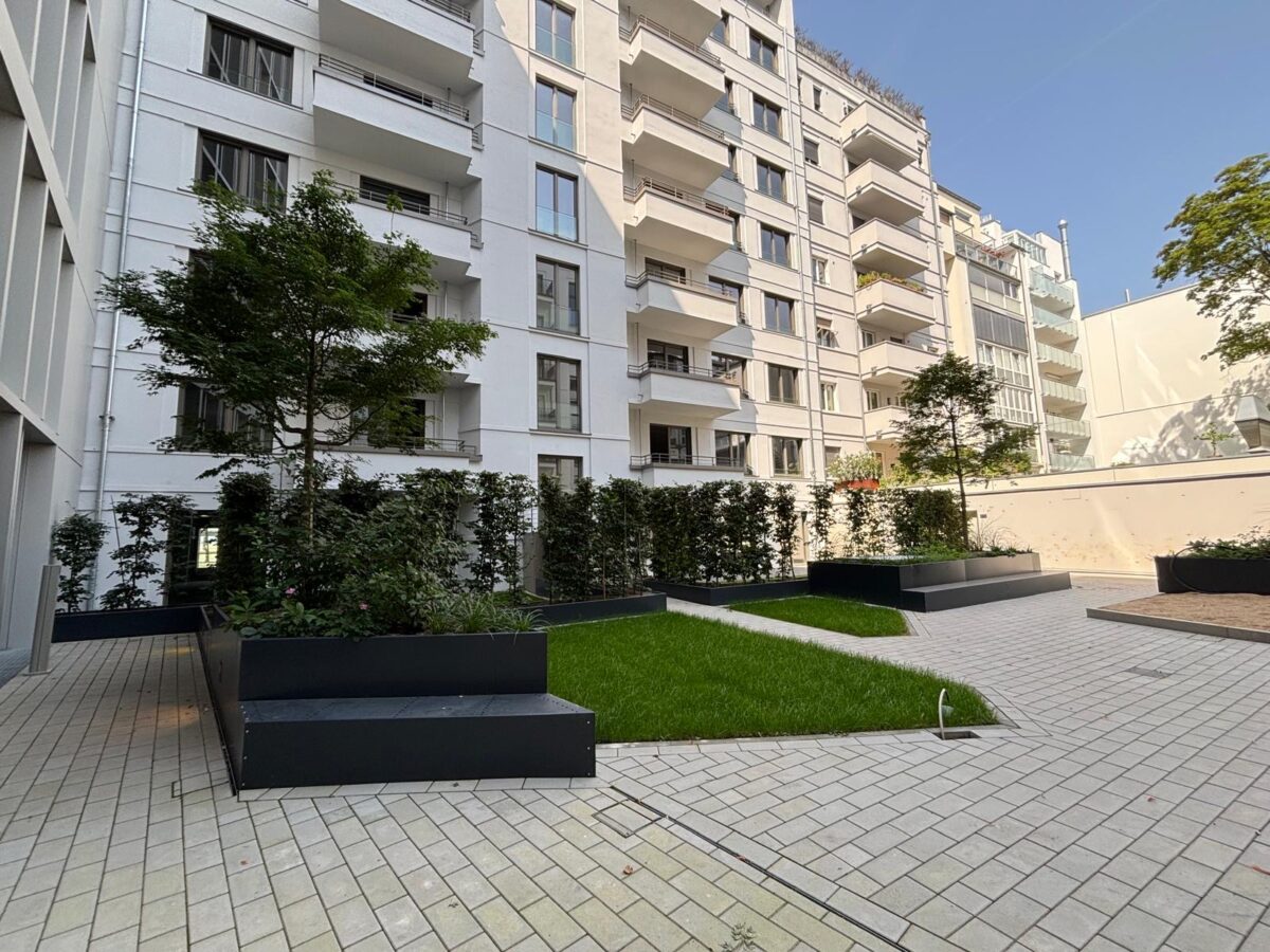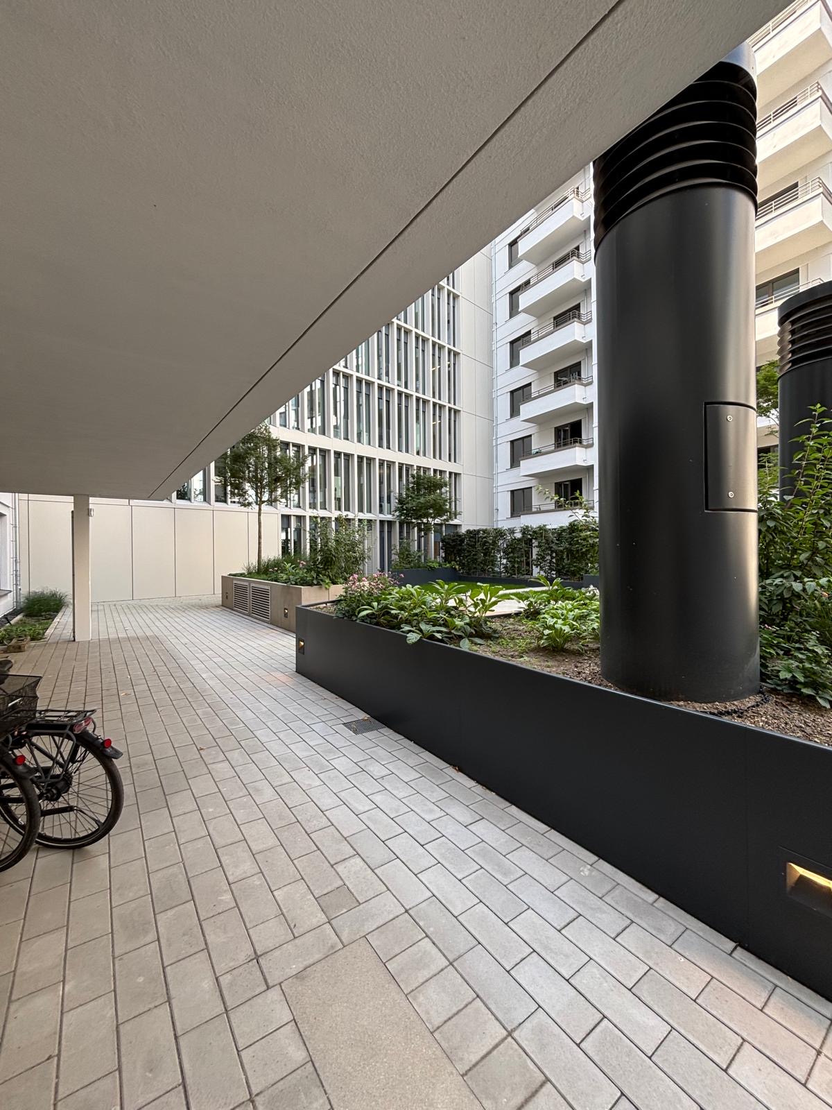 The outdoor area adjacent to Berger Allee and the access path toward Mannesmannufer has been given a cohesive and welcoming design, reinforcing the building’s strong urban presence and inviting atmosphere. LAND’s design focuses on enhancing the public realm through carefully curated interventions that echo the building’s sustainable ambition.