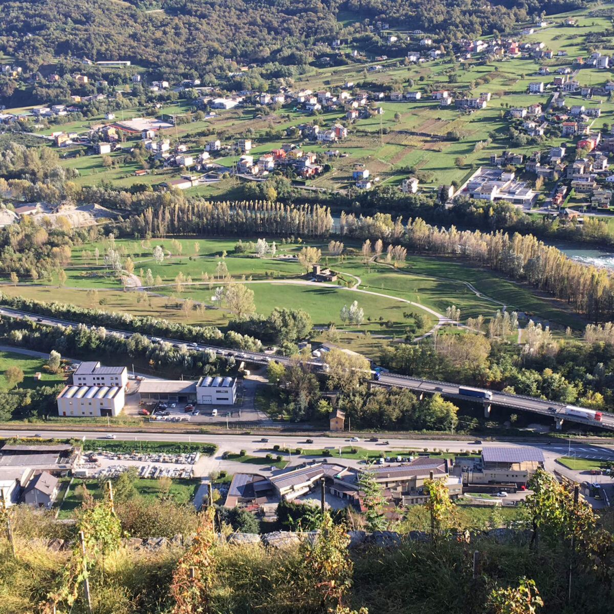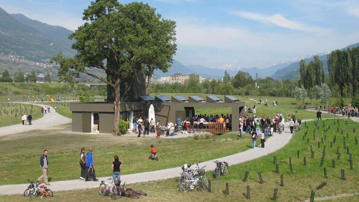 The park is situated to the south of Sondrio, at the confluence of the Adda and Mallero rivers. Until 2006, the area was occupied by an inert processing plant and used for the storage of various materials. Following the cessation of these industrial activities, an urban transformation project was initiated, paving the way for the development of the Technological Pole, promoted by the Credito Valtellinese banking group. Remarkably, the site’s redevelopment began even before the architectural works commenced through an early greening process known as preverdissement.