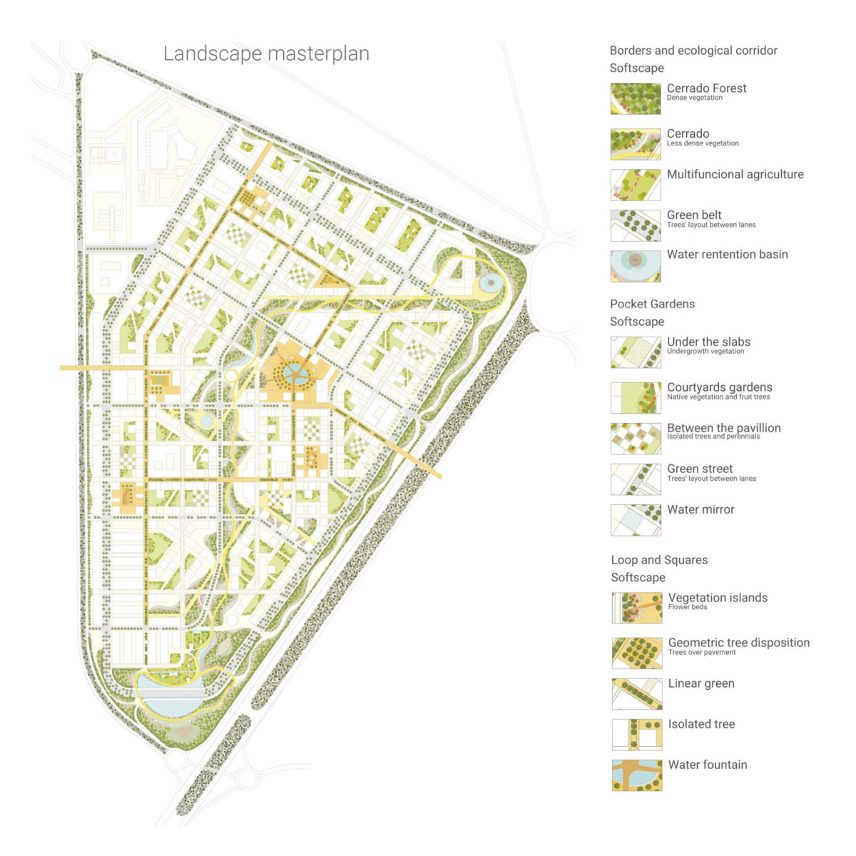 The landscape project covers an area of 96 ha and foresees 1.5 ha of multifunctional agriculture, 13 ha of restored Cerrado, 26 ha of green areas, 5.000 mq of water fountains, 15.000 mq of water retention basins, 2 km of ecological corridor, and 3 km of a pedestrian and bicycle loop that connects six thematic plazas, which create a strong interconnection between the two existing fragmented ecosystems.