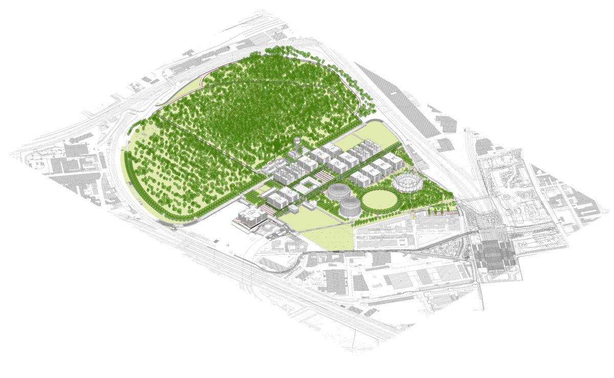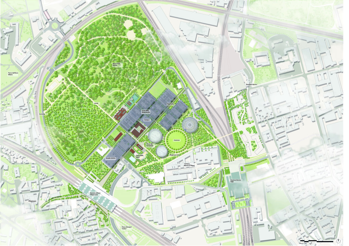 Within this framework, the transformation of the area is based on the creation of an articulated system of green spaces, sports facilities, and ecological connections, while preserving the spontaneous woodland that has developed in the northern portion of the former industrial site. The overall objective is the creation of a new large urban park for the city of Milan, conceived as a new component of the “Raggi verdi” strategy.