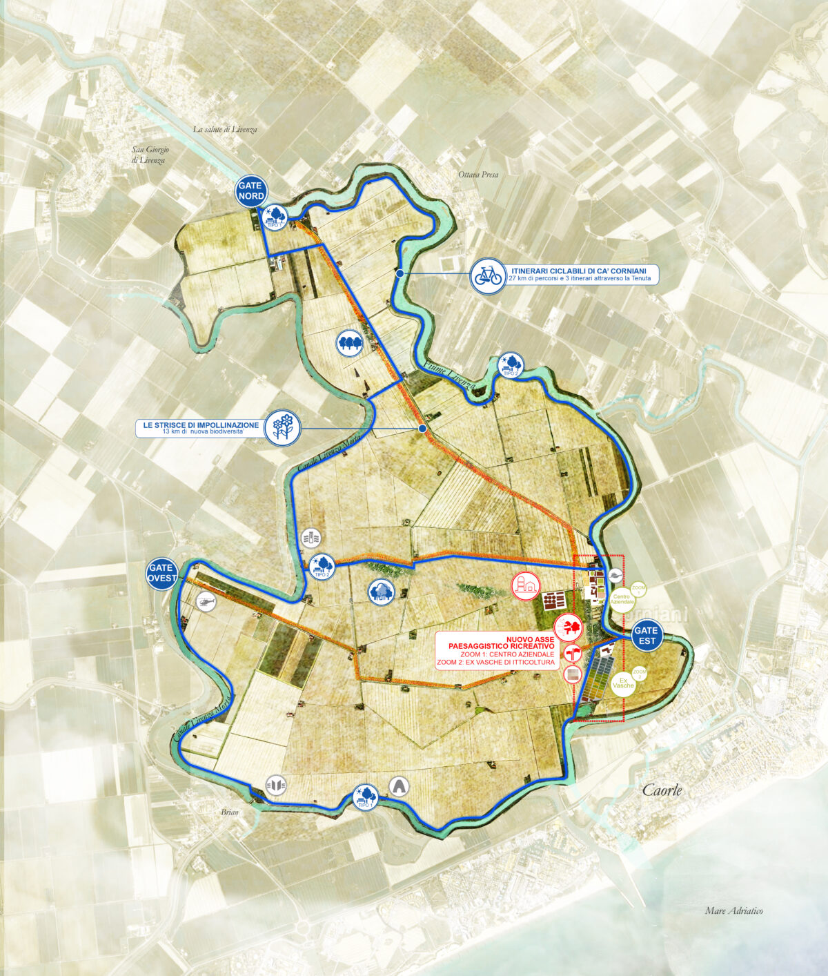 The underlying concept is cultivating the land to guarantee food production by respecting nature and caring for the rural, historical and environmental heritage associated with the countryside, proposing a “productive landscape“. Therefore, the landscape project’s approach aims to enable the identity of the Ca’ Corniani image to emerge in continuity with its history, sparking a process of awareness and openness towards the territory and the community that welcomes it.