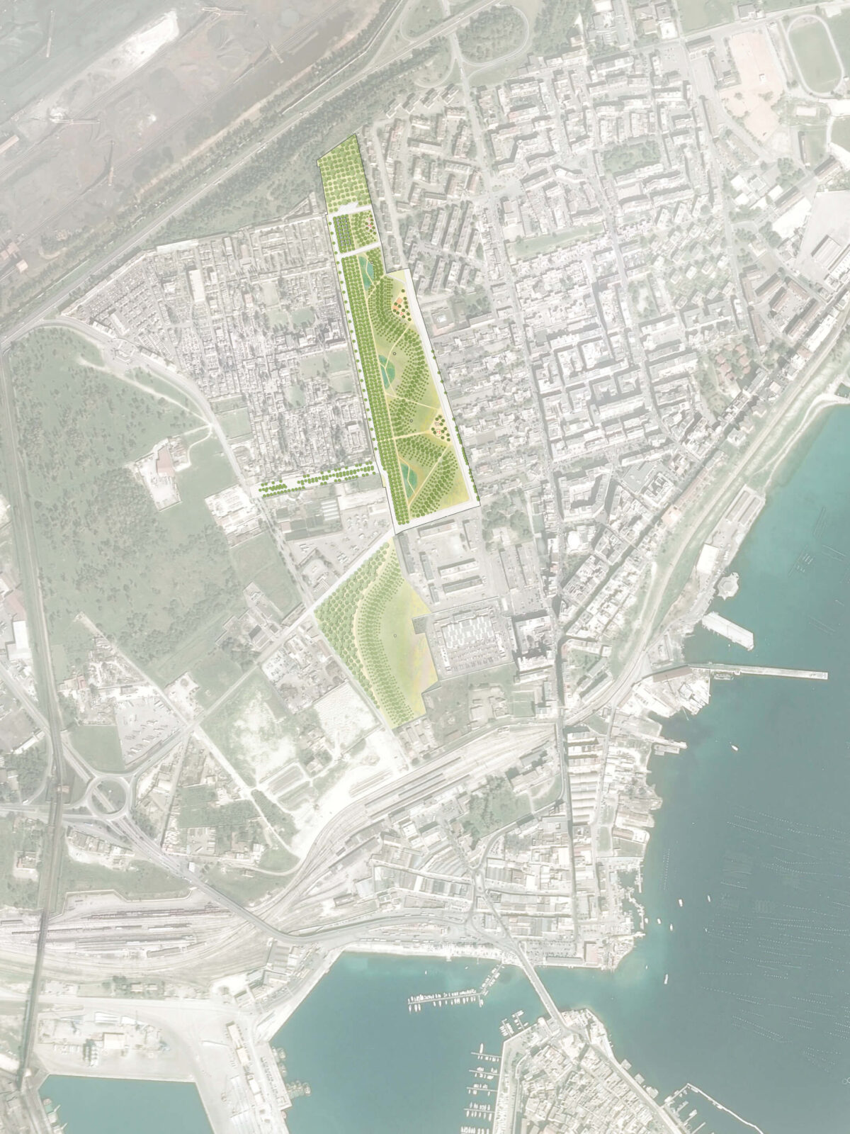 A regeneration of nature’s elements: The Municipality of Taranto, through a European tendering procedure, awarded us the contract to design a scheme for upgrading, redeveloping, and reactivating a degraded area of the Tamburi District. This is a testament to their commitment to the project. Our vision is to create an ‘urban forestation‘, a unique blend of nature and urban development, with extensive areas for phytoremediation and a public park with facilities.
