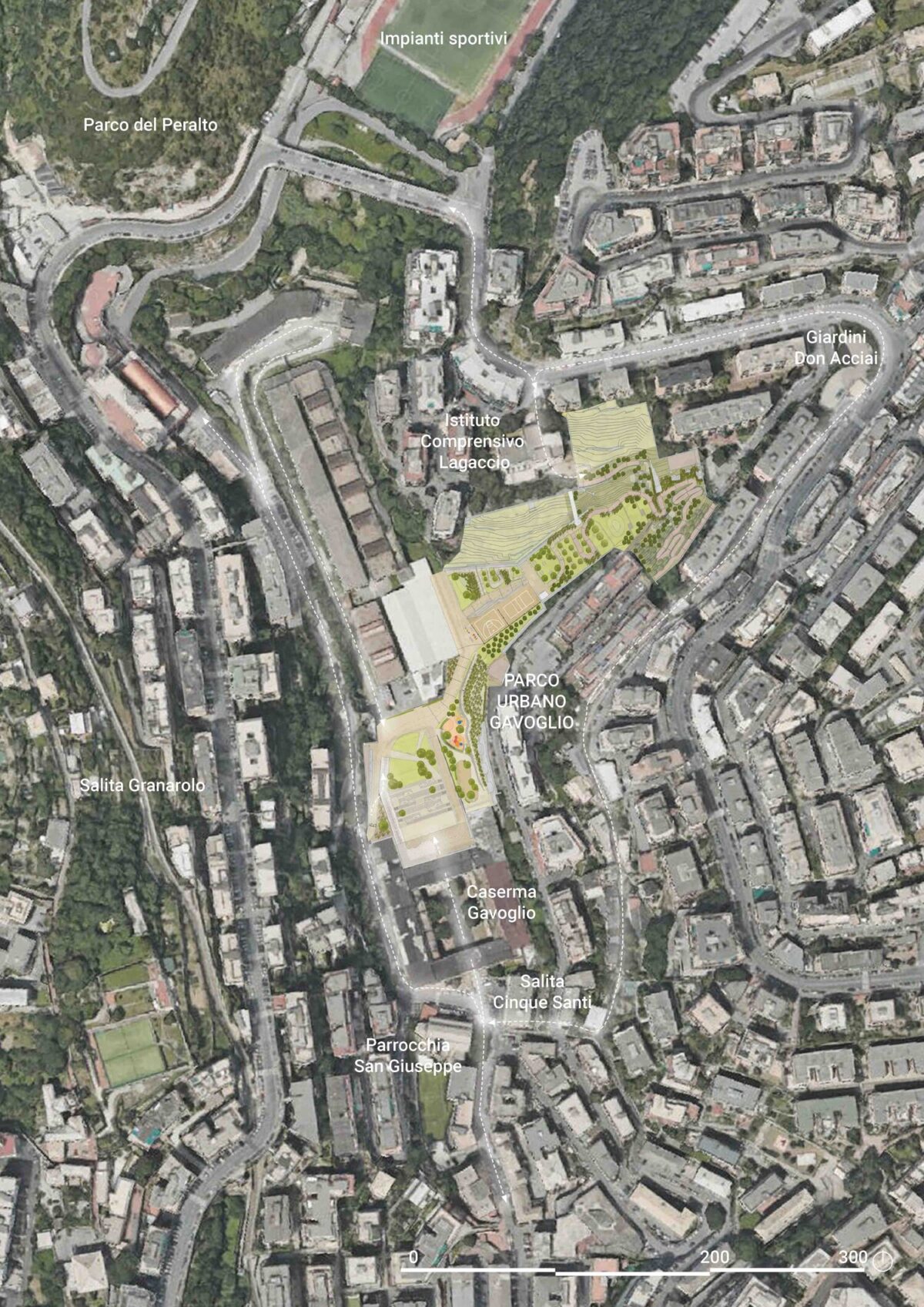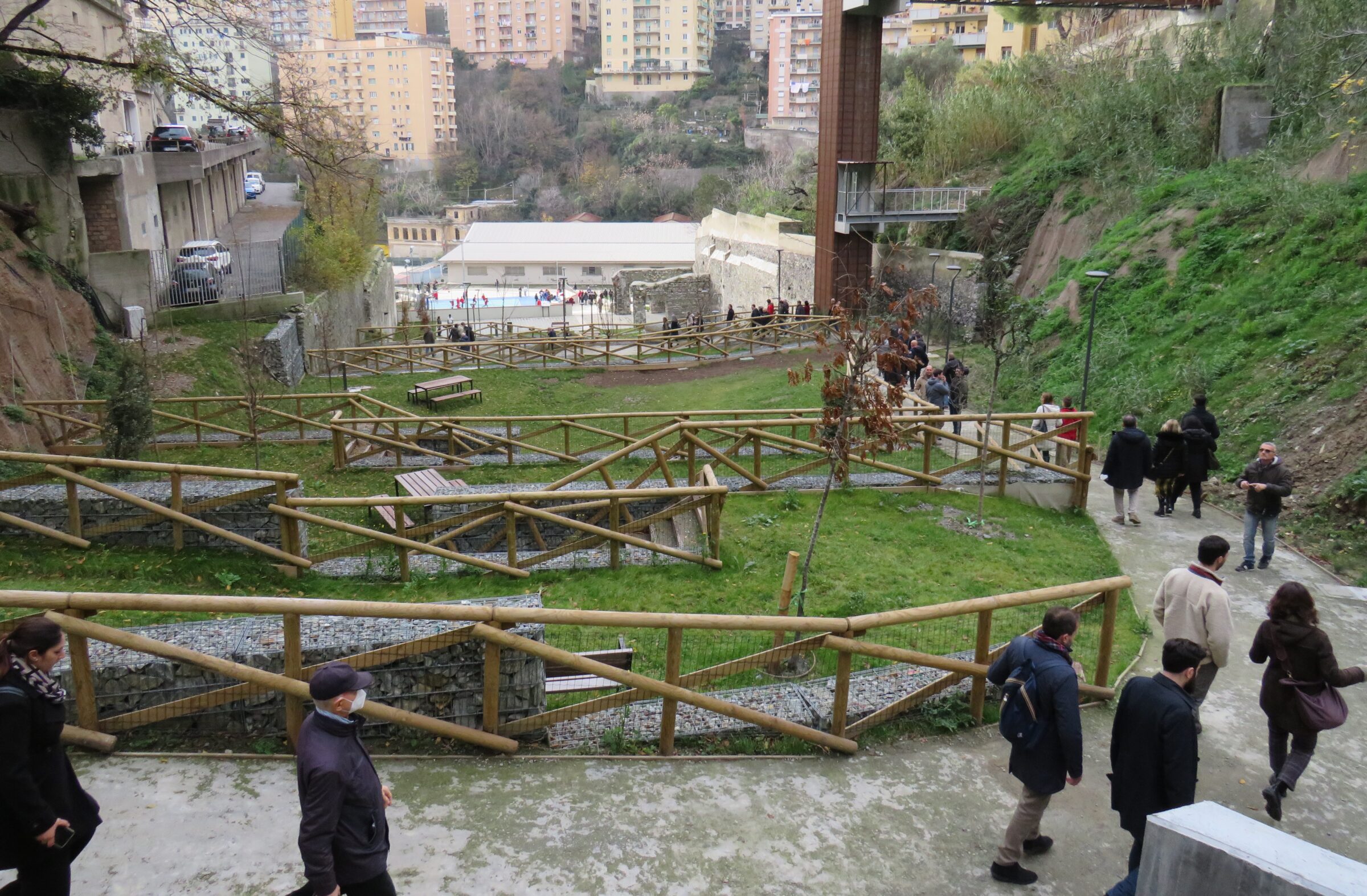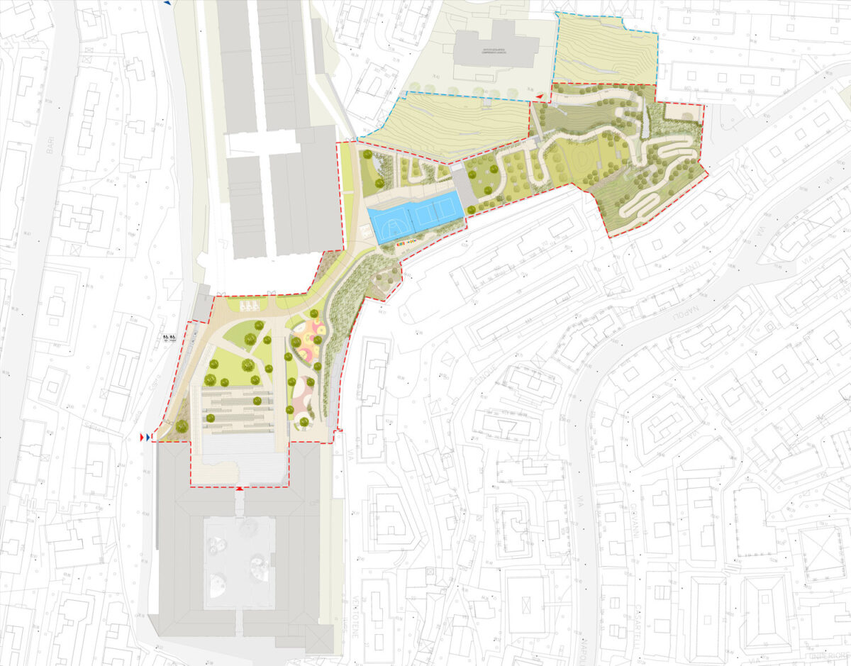The Gavoglio barrack is located in the Lagaccio District, one of Genova’s most densely built and socially vulnerable neighbourhoods. The project results in a new park for the community, opening the inaccessible industrial compounds and strengthening the connection with the upper part of the district, till Parco dei Forti, a protected natural area on the hills. It offers new green areas, playgrounds, sport facilities and aggregation spaces for the citizens.