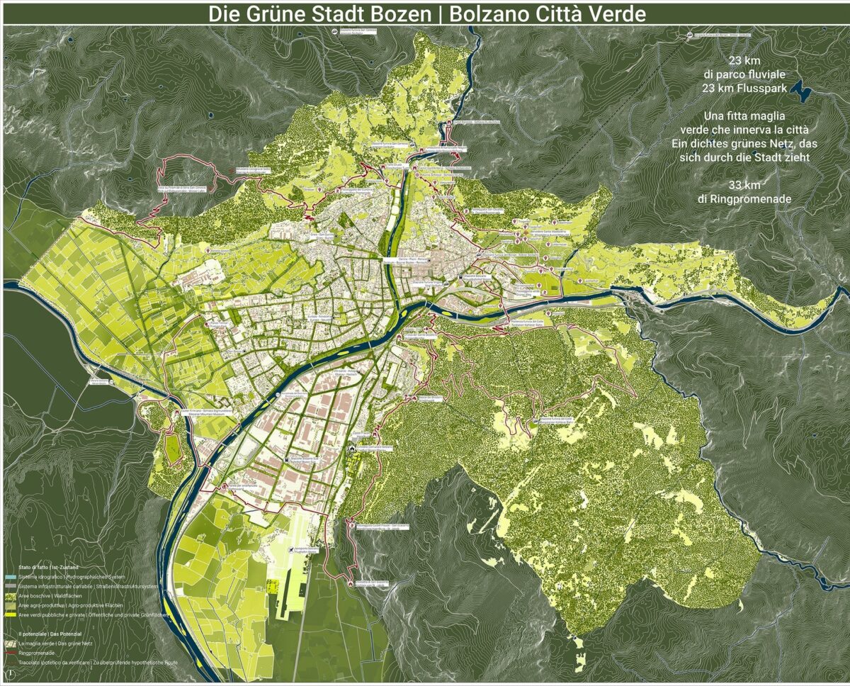 The municipality of Bolzano has undertaken the process of realizing a Green Plan through the new Provincial Law 9/2018, “Territorio e Paesaggio,” and the D.P.P. 17/2020, which sets new urban standards for urban green areas. The goal of the Plan for Bolzano is a greener city that encourages contact between nature and citizens in and outside the city.