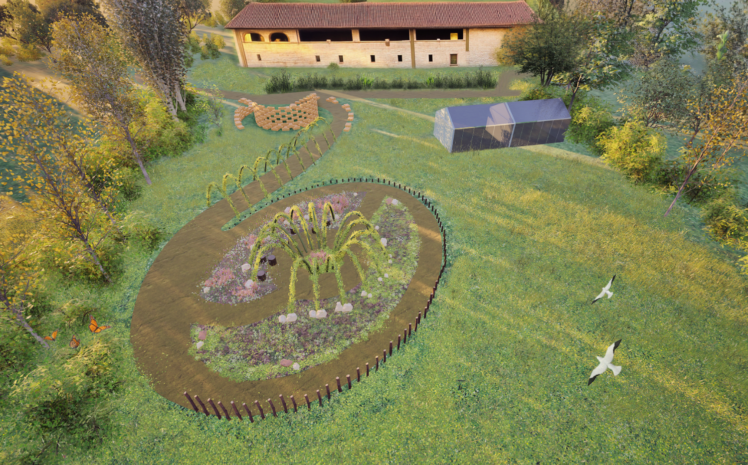Along the elliptical path, living willow structures create shaded areas and green tunnels that change shape and color throughout the seasons, accompanied by flowering meadows that evolve over the year. The use of natural and permeable materials allows the path to function as a Nature-based Solution (NbS), improving rainwater drainage, reducing water stagnation, and increasing local biodiversity in alignment with the objectives of Parco Agricolo Sud Milano.