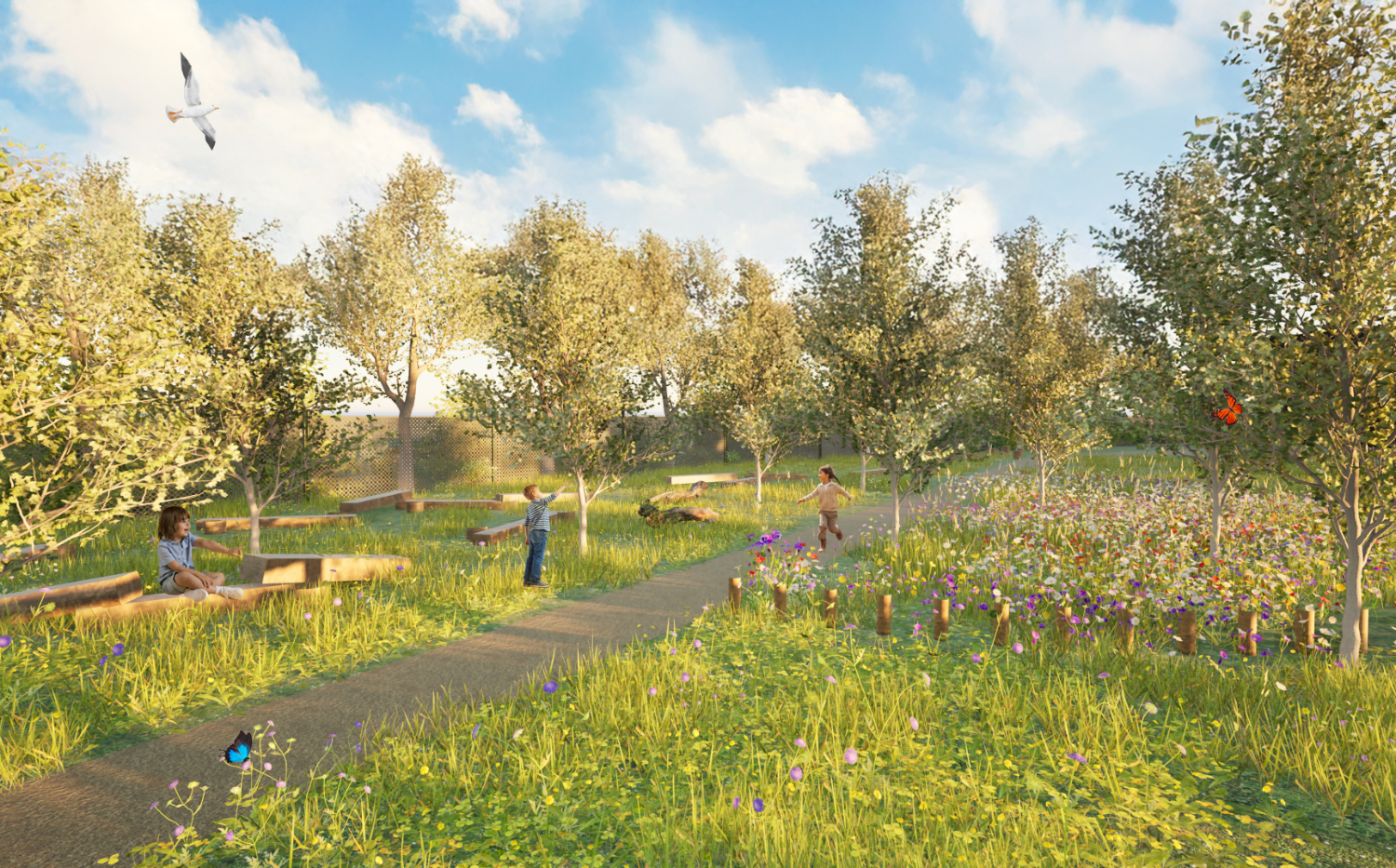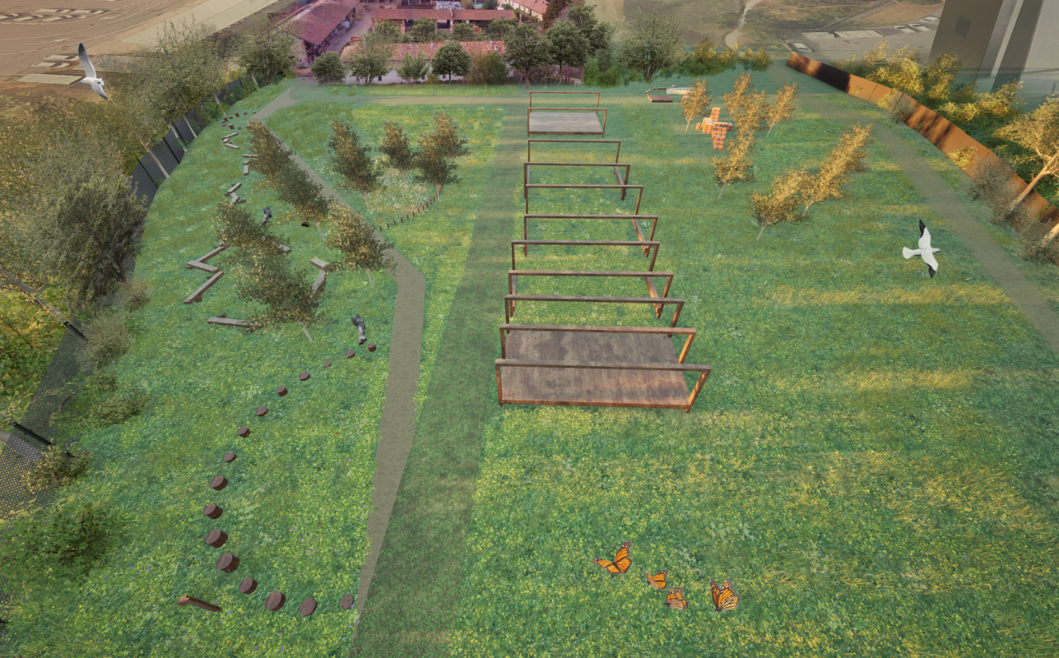 Meeting and resting areas are conceived as open green spaces that combine existing polyphytic lawns with newly introduced flowering meadows composed of native species, fostering biodiversity and supporting pollinating insects. Low wooden elements subtly define different zones, while recycled timber beams provide informal seating and gathering points, encouraging pause, sharing, and inclusive use of the space.