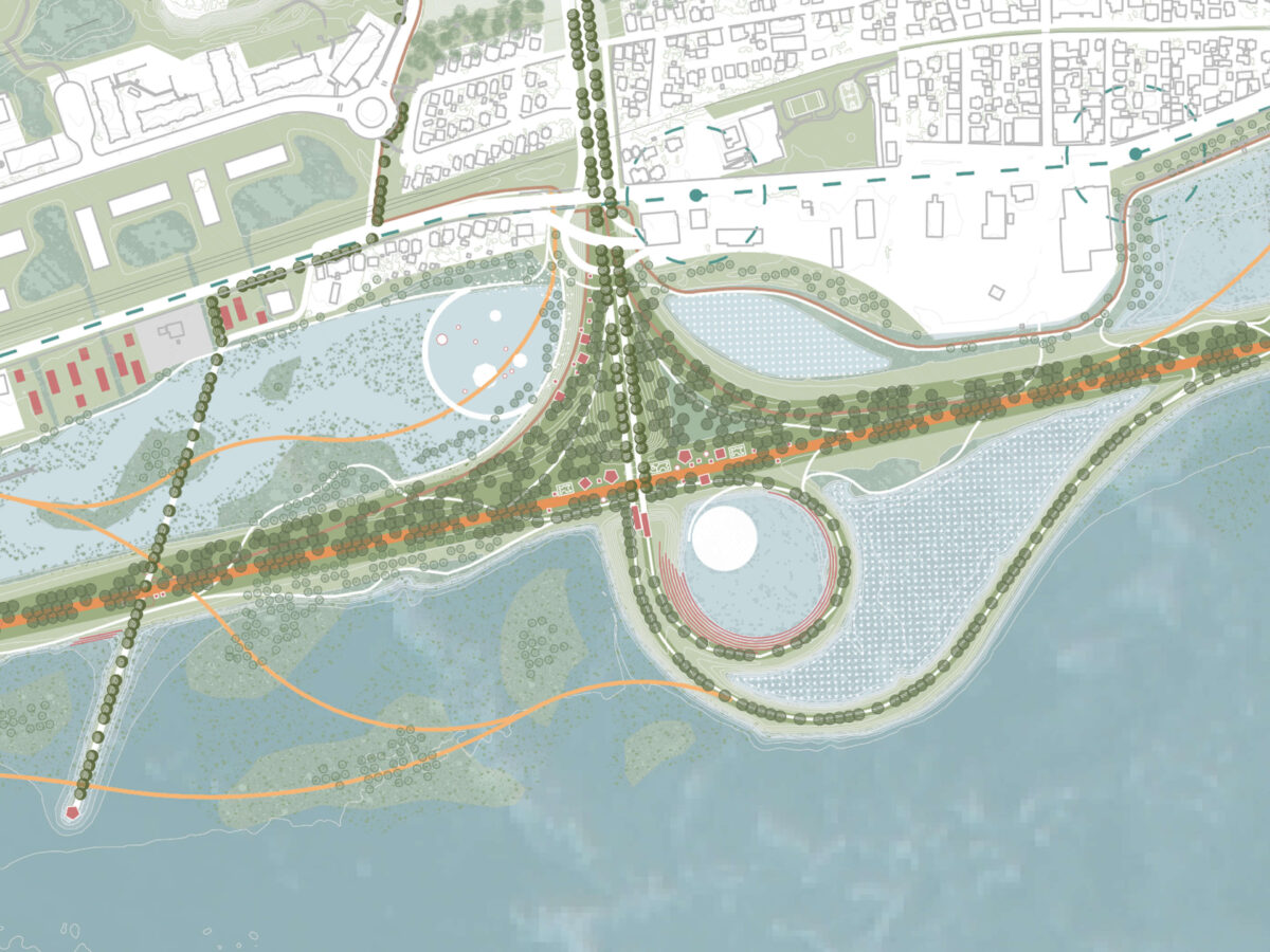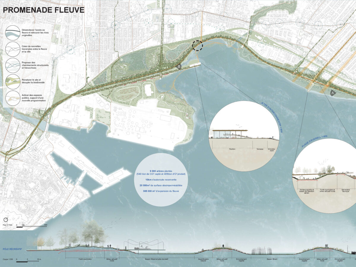 La Promenade Fleuve is the answer to the ideation competition launched by the Quebec government to imagine the redevelopment of phase 4 of the Saint-Laurent River, with particular regard to the green and blue infrastructure of the area.