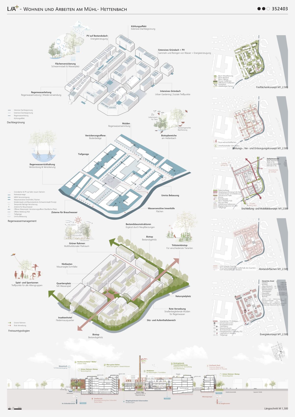 A continuous green corridor runs along the Mühl-Hettenbach stream, linking local biotopes and enabling smart water and air management through sponge city and blue-green infrastructure strategies. The project aims to reconnect the area with its ecological and social context while serving as a model for climate-adaptive development in Augsburg.