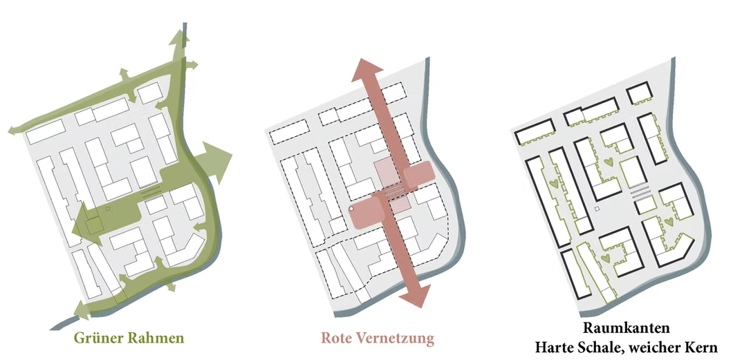 The preserved Halle 13, a steel-truss industrial hall, becomes the site’s social hub, connecting north to south and east to west. It integrates a music school, community café, and functions as a public passageway linking major open spaces: Eberleplatz, the industrial chimney “Schlot”, and a new riverside park.
