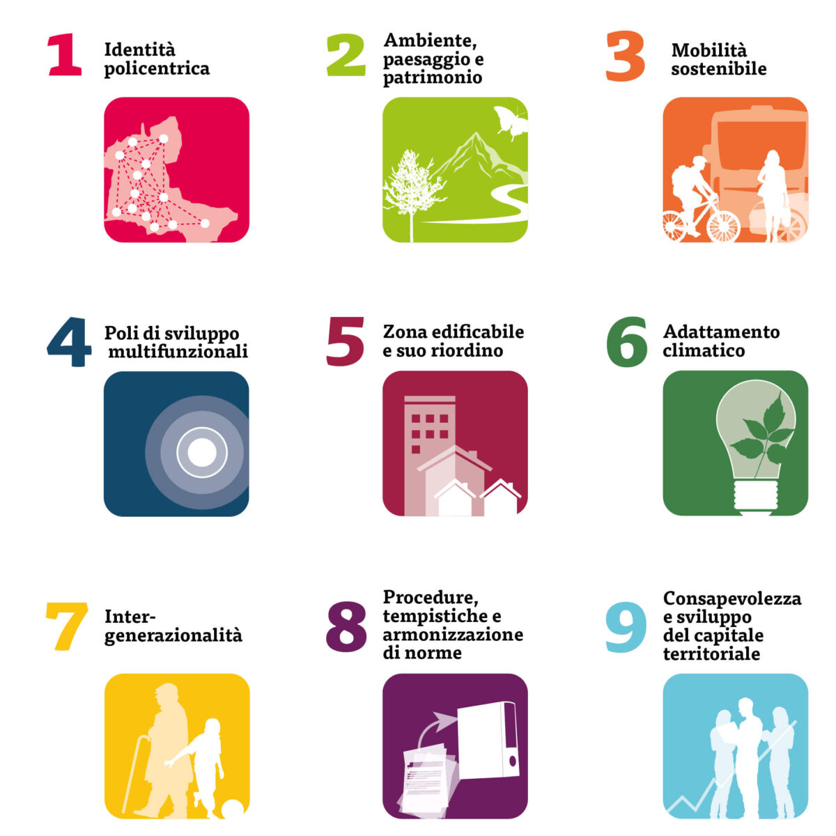 The PAC is a dynamic, living instrument designed to establish the directions, methods and stages of the future development of the new Comune with the final objective of achieving harmonisation of the 13 existing Regulatory Plans (PR); the new plan is structured around nine main themes: