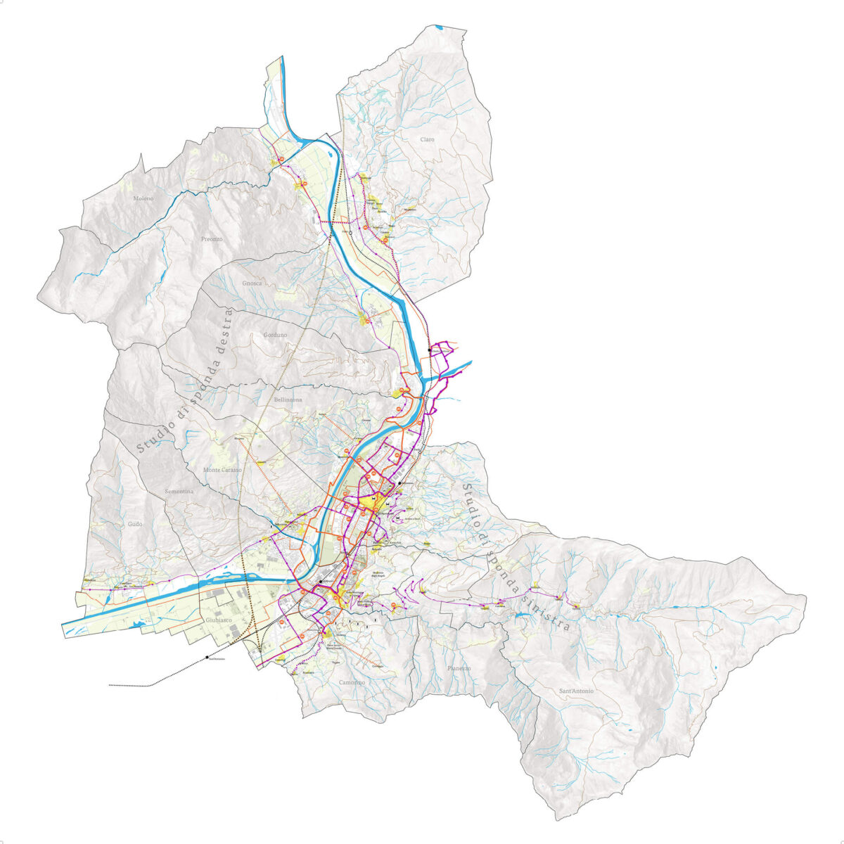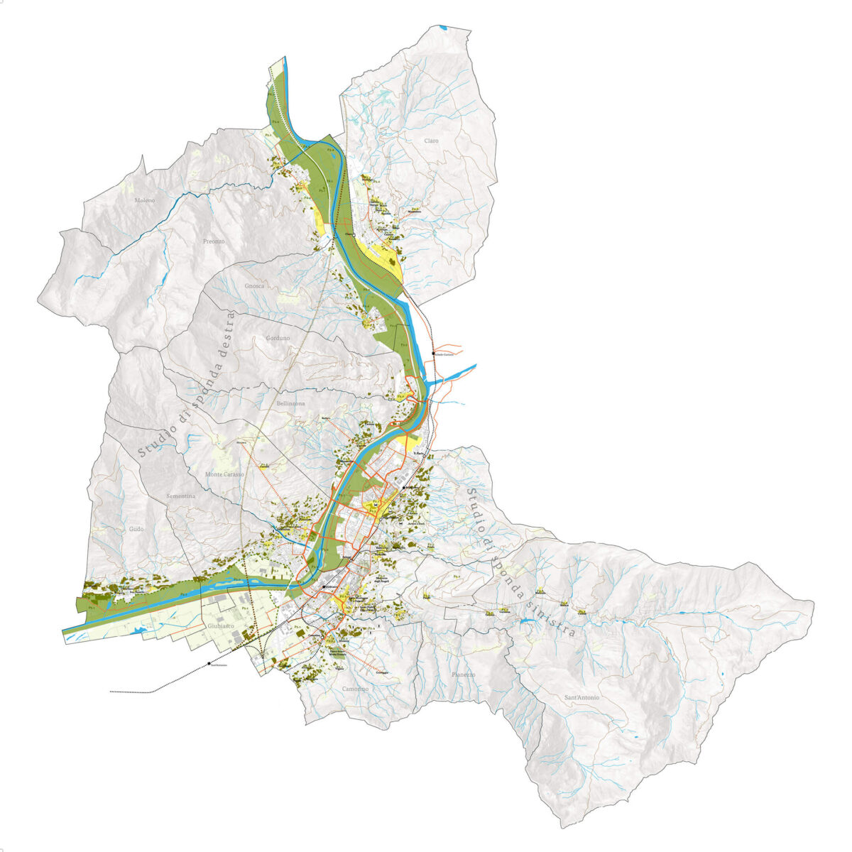 The aim of the project was the setting-up of the document Programma d’Azione Comunale (Municipal Action Programme) in a synergic collaboration with the Dicastero territorio e mobilità of the Municipio of Bellinzona. The guiding principle for the working team was drawing particular attention to landscape valorisation and virtuous territorial development.
