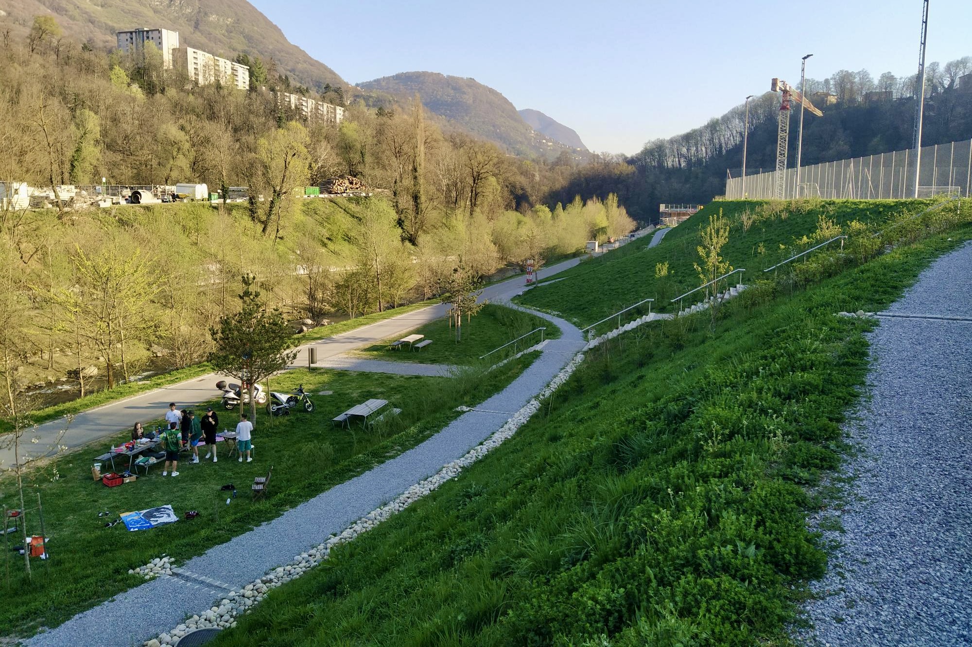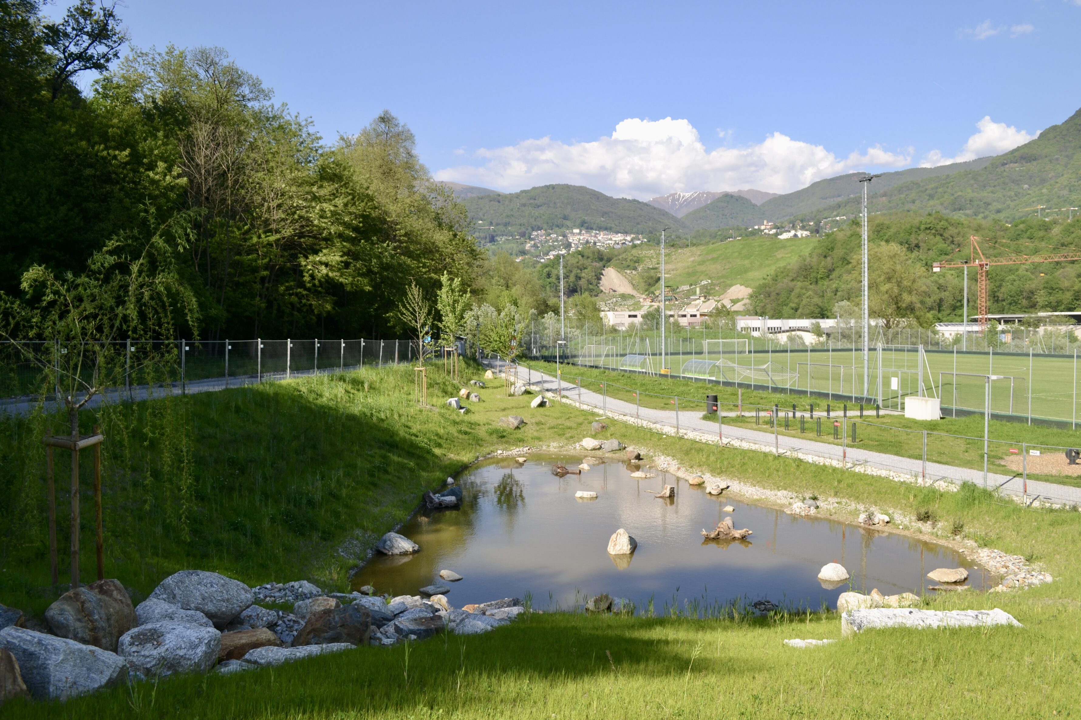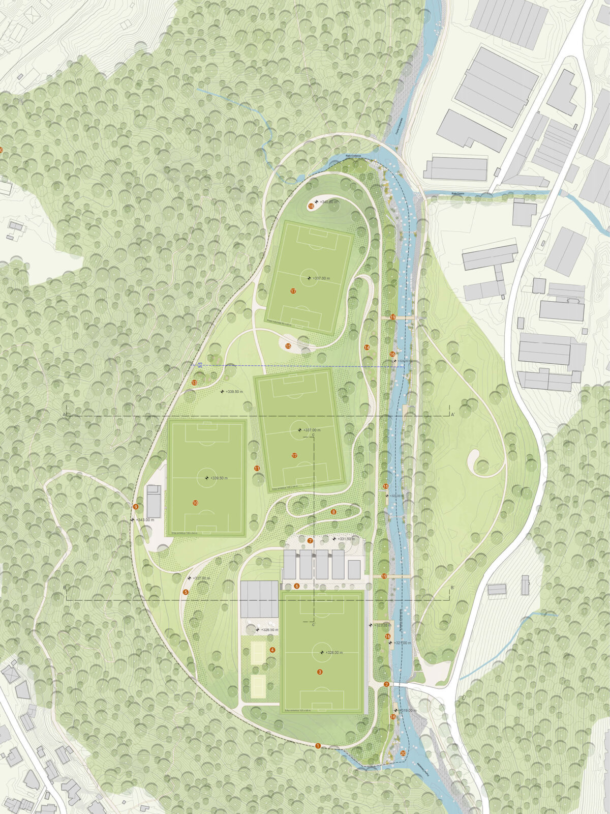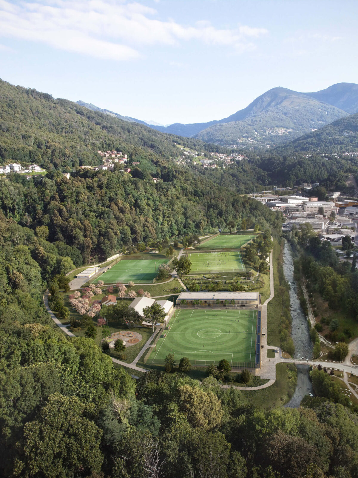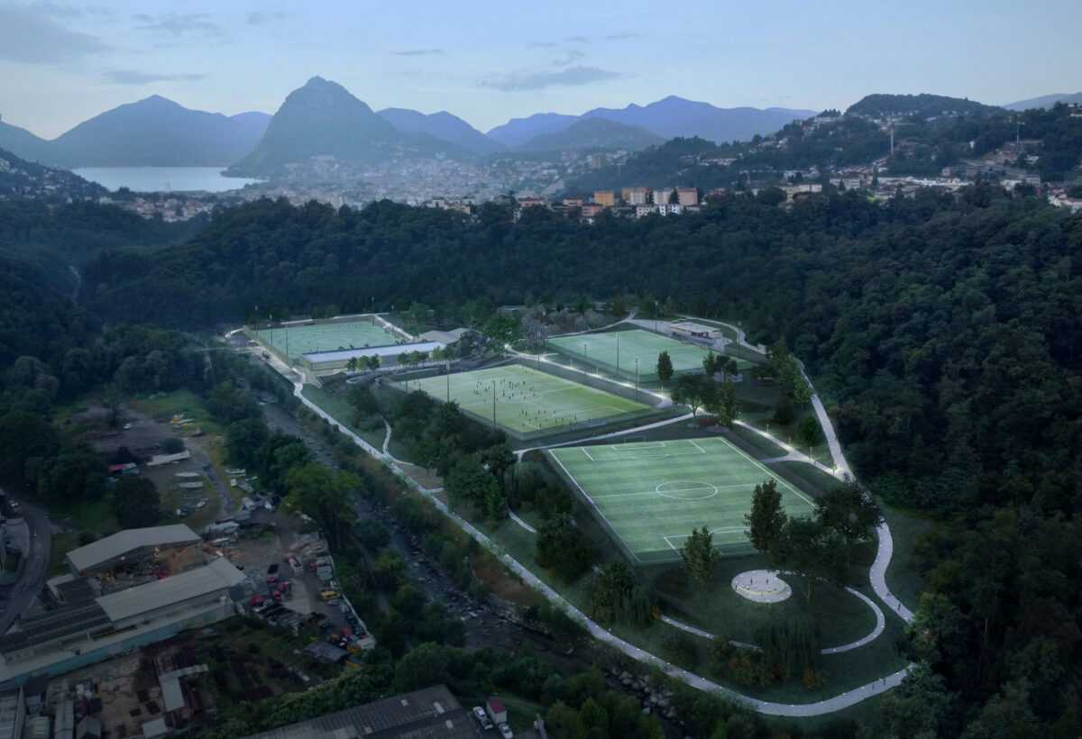 The project develops the concept of an integrated sports park, where the naturalistic and landscape components are associated harmoniously with the built components, giving rise to a single large sports and recreational area called the Parco dello Sport. Coming about as a result of the need to create a new stadium for Lugano to replace a structure that was obsolete and inadequate in terms of safety and the development of the sports sector in which Lugano excels, the Parco dello Sport was conceived to enhance the entire Maglio urban area and bring an abandoned peripheral ward back to life, turning it into a destination of wellbeing for all citizens in a renewed context of the urban landscape. The Parco dello Sport is developed as a new living space for the Lugano area, a large green lung open to all where the necessary sports facilities are welcomed within an oasis of nature and biodiversity near the dense urban fabric that accompanies the green ray of the River Cassarate in its city section.