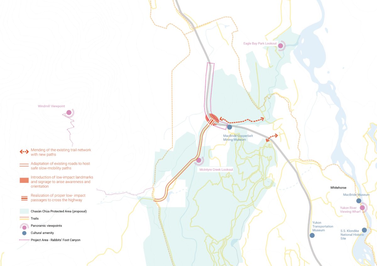Alongside Momentum, LAND developed a study at the request of the Yukon Government for Rabbit’s Foot Canyon, part of the Whitehorse corridor and a key component of the broader Alaska Highway Multi-use Trail Masterplan. This proposal aims not only to improve safety and connectivity across the corridor but also to enhance economic development and tourism opportunities for the territory, aligning with a strategic vision that integrates ecological, social, and cultural values.