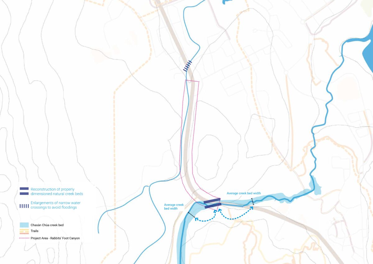 Reconstructing creek beds to their natural dimensions and widening narrow water crossings will restore the original flow, reduce flood risk, and support better water management. Recommendations include minimizing the impact of infrastructure works on existing natural and wildlife areas of great value and significance.