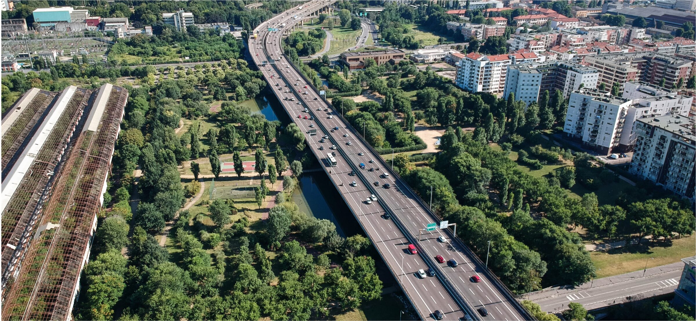 The project focuses on reconnecting fragmented landscapes and enhancing the natural environment across the site, which was once disjointed by the Lambro River and the imposing Tangenziale Est Milano viaduct.