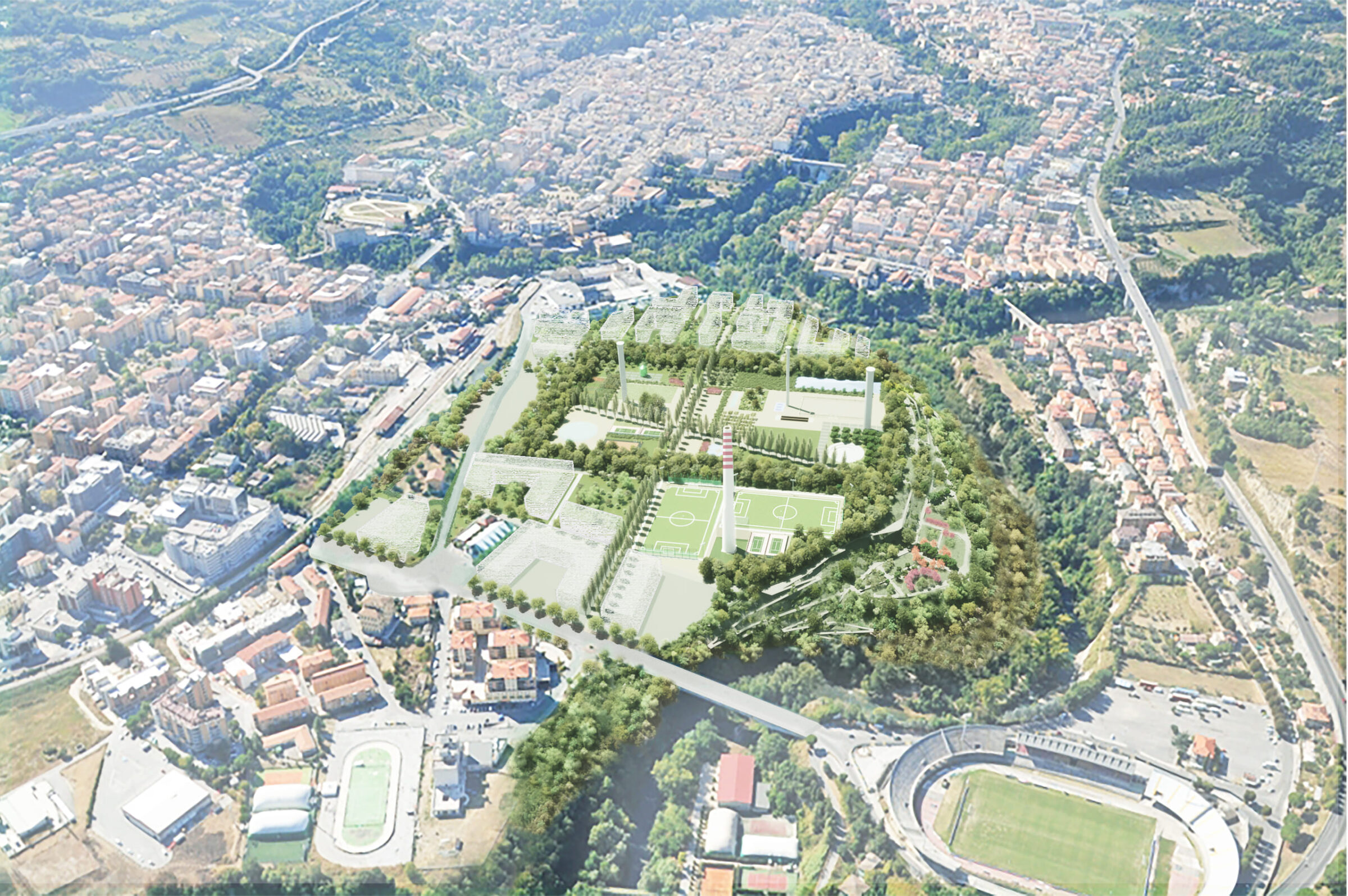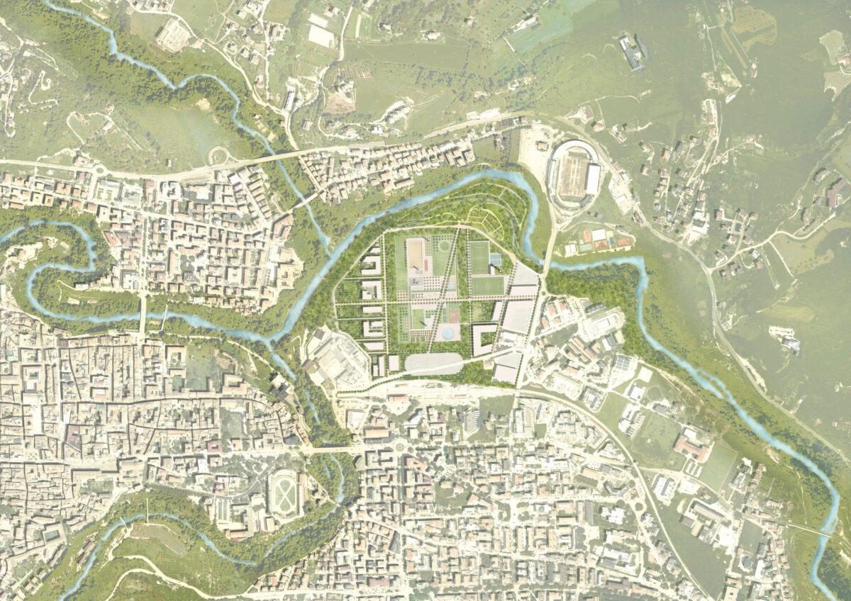A 24-hectare ecological network, developed along the Tronto River, is designed to restore habitats, increase biodiversity, and promote climate resilience. Over 2,500 trees will populate the site, creating a new green lung for the city. The masterplan integrates Ascoli Piceno’s historic urban fabric—its cardo and decumanus axes—linking cultural heritage with new ecological and functional systems. Landscape-led planning fosters a cohesive urban framework, combining green and blue infrastructure with nature-based solutions.