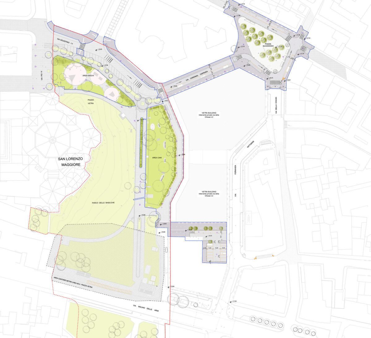 The Vetra Building public spaces regeneration reimagines the urban landscape surrounding Milan’s historic heart, enhancing the relationship between the Basilica of San Lorenzo and Parco delle Basiliche. Through the renewal of streets, squares, and green corridors, the intervention strengthens pedestrian connectivity, restores identity to fragmented public spaces, and merges historical heritage with a contemporary vision of urban life.
