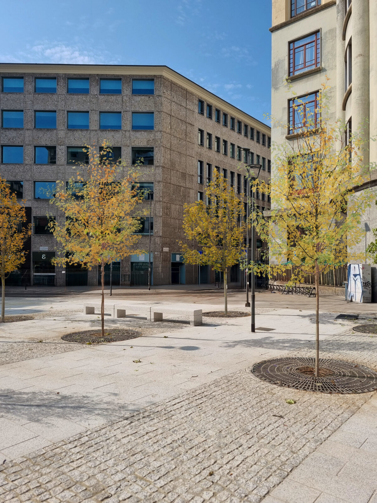The transformation around the Vetra Building defines a new public identity for an area long dominated by traffic and fragmentation. At Piazza Quasimodo, the redesign prioritizes pedestrians and greenery over vehicles, eliminating surface parking and creating a 1,000 sqm pedestrian island framed by mature trees and natural stone paving. The elevation of the entire surface to sidewalk level enhances accessibility and expands the sense of openness, visually connecting the square to the façades that define it. The new layout integrates bike racks, benches, and shaded rest areas, establishing a lively urban space that reflects the Lombard tradition of stone craftsmanship while directing one’s gaze towards the historical church, and inviting social use.