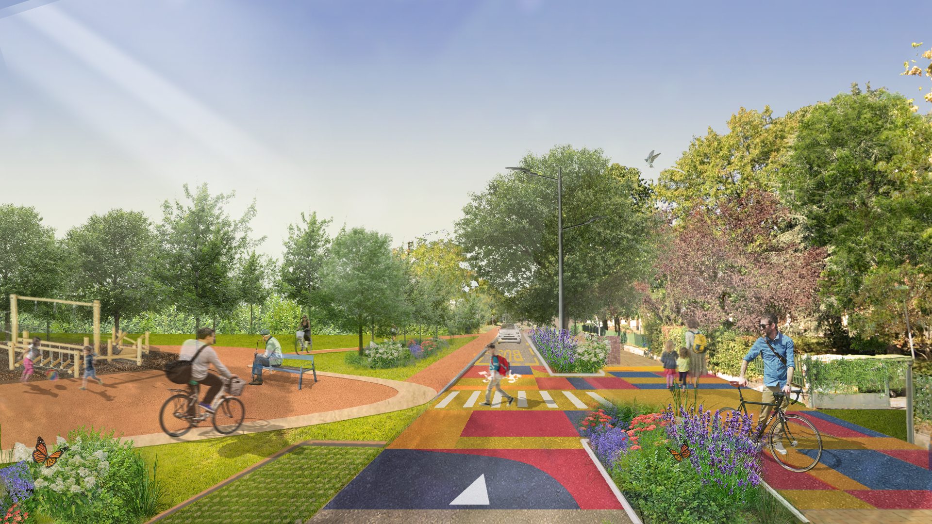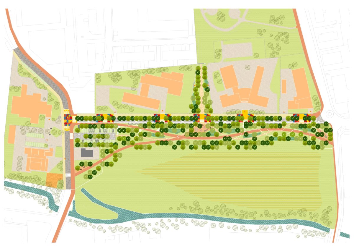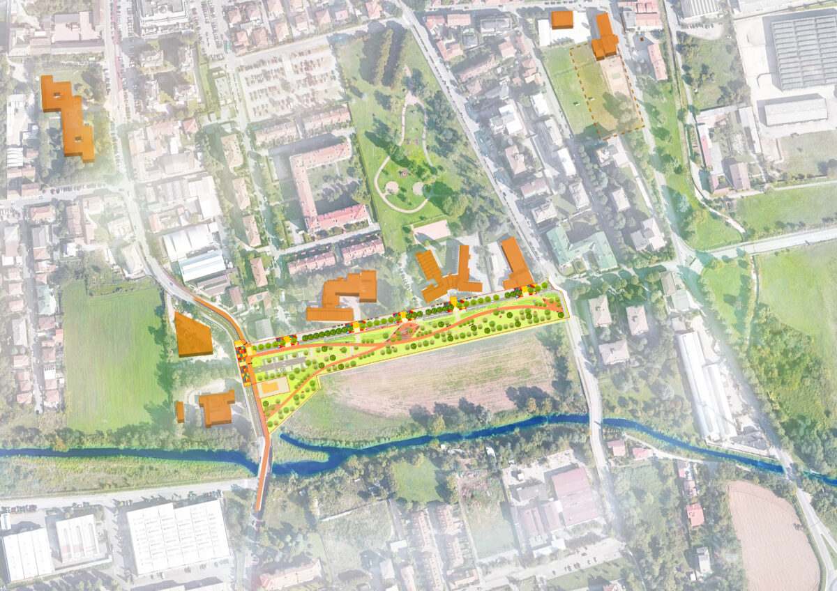 With the goal of making Via Tevere a true public space returned to the citizens, the introduction of bike paths—connected to the soft mobility routes of Via S. Martino and Via Ghisolfa—and pedestrian paths within the green area toward the Olona River aims to create a new system of accessibility and use. The winding paths through the park intersect three functional areas: two connected to Via S. Martino and Via Ghisolfa, which act as equipped gateways, and a central area featuring a playground space for students coming out of school.