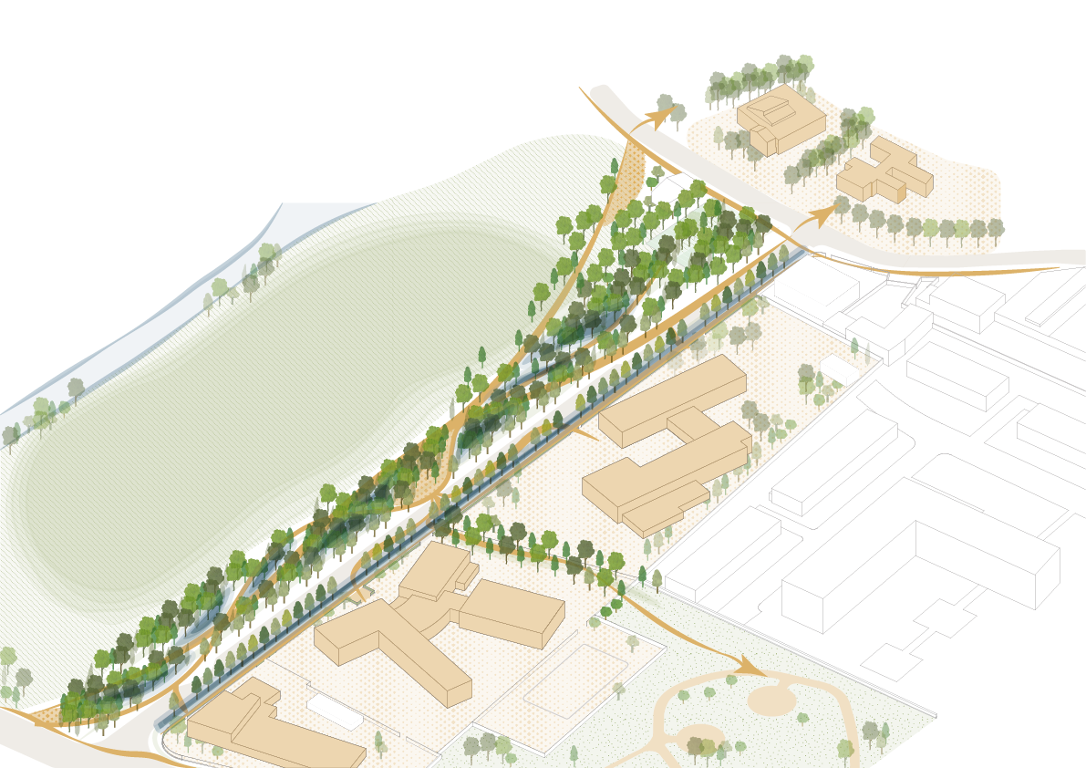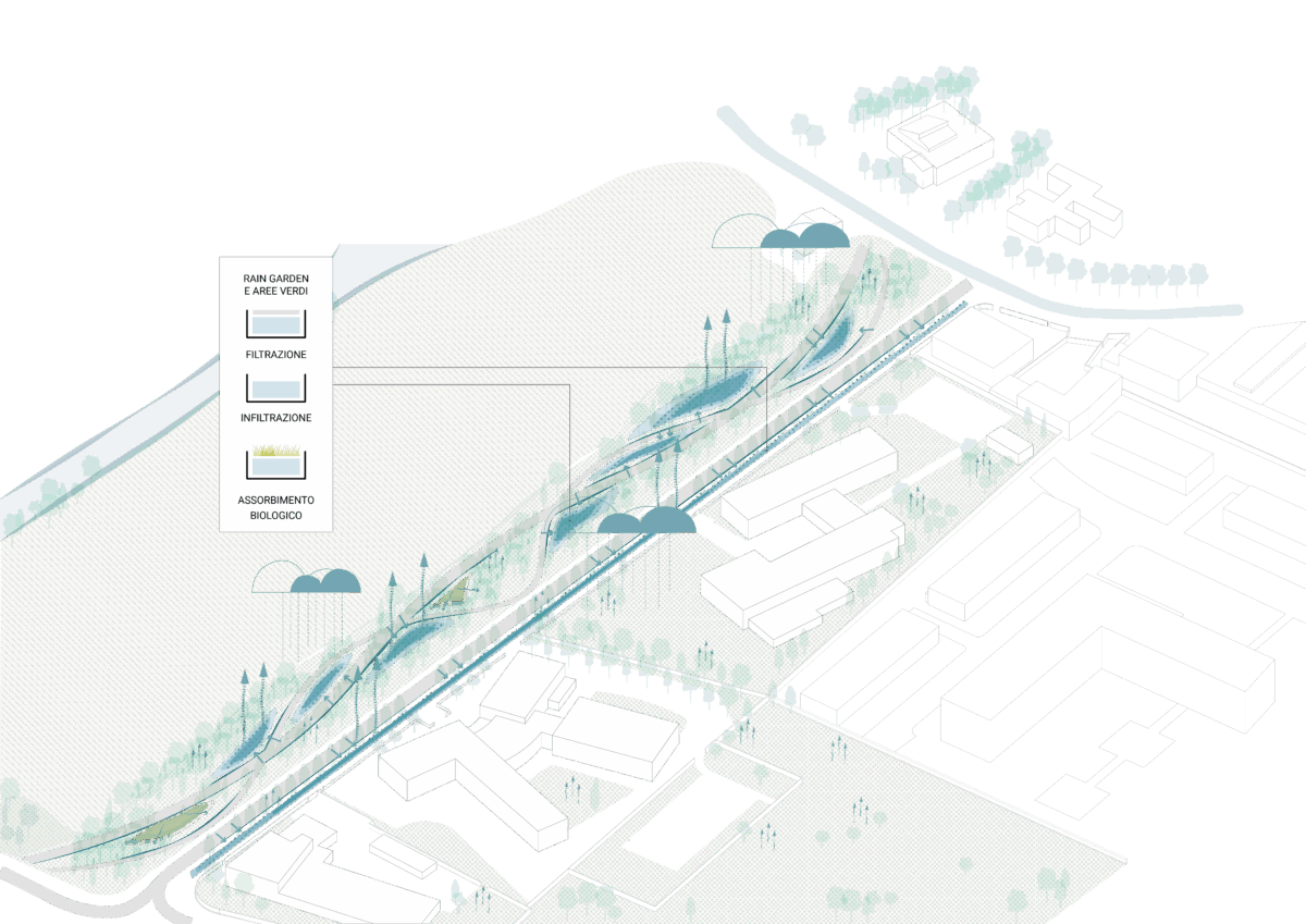 Water is managed through a system of raingardens and basins, nature-based solutions that contribute to sustainable urban drainage. On the side of Via Tevere facing the schools, a linear rain garden system is introduced to collect water from the road and sidewalks. In the park area, vegetated basins are created to serve as a buffer between the road and the park paths, contributing to a dynamic and biodiverse environment. These basins also serve as water retention areas during significant weather events, acting as true environmental devices in support of the existing sewer system.