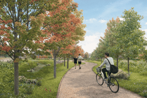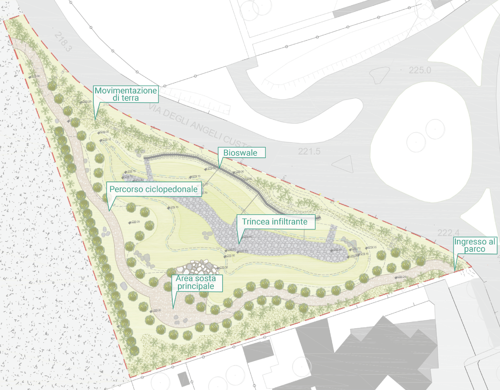 The park will feature bioswales, bioretention systems capable of filtering stormwater and promoting its natural infiltration into the soil; the refurbishment of the parking lot pavement near the Armando Diaz Comprehensive Institute using permeable materials to limit soil sealing; and the construction of a new stormwater drainage network designed to convey rainwater toward green areas, supporting natural absorption processes.